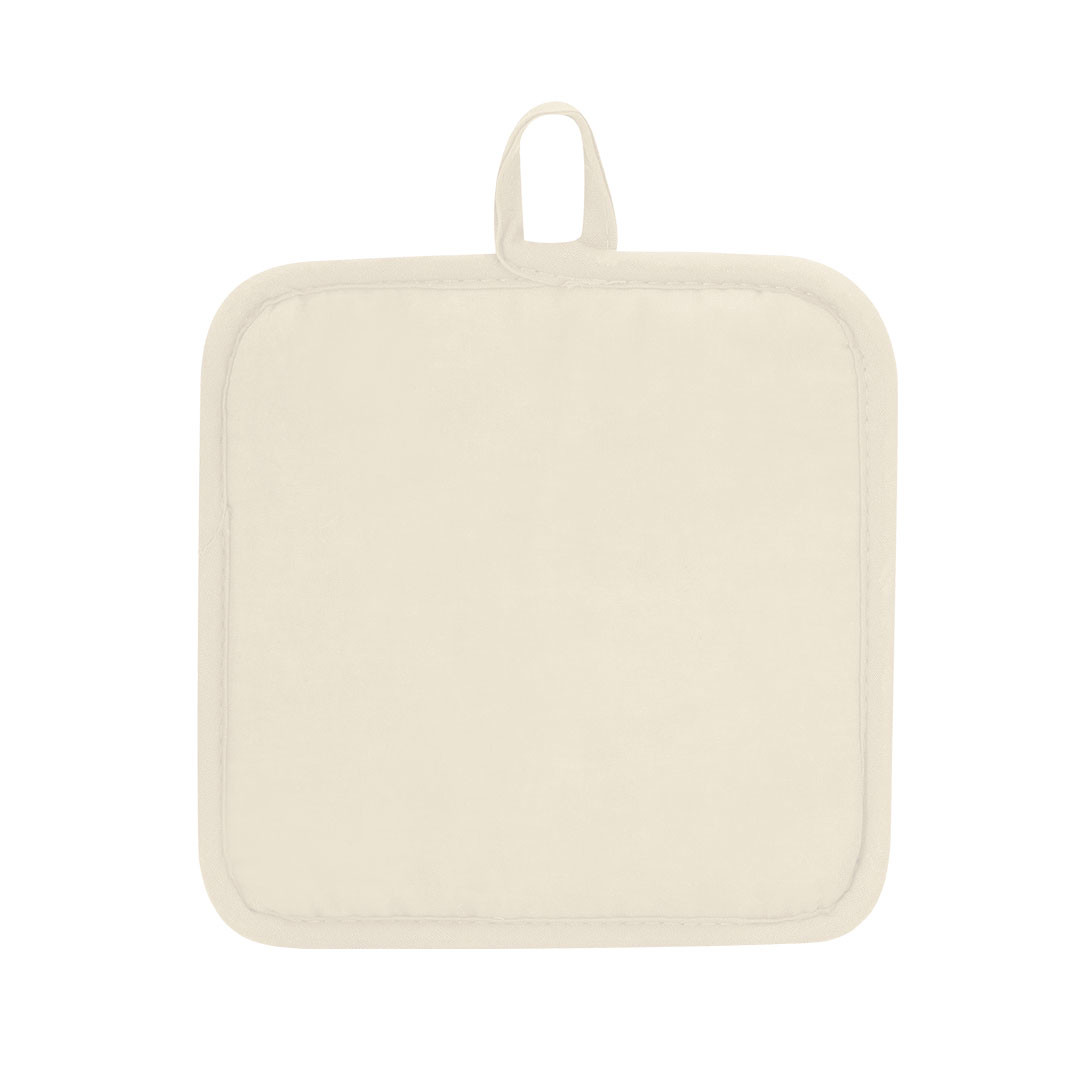 Agarrador de cocina en suave material 100% poliéster de suave acabado en color blanco y con bordes en vivos colores. Con una cara lisa especialmente diseñada para sublimación y cinta para colgar. Una Cara Lisa para Impresión