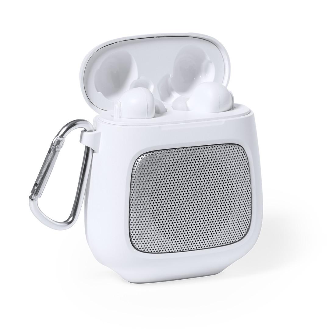 Originales auriculares altavoz con conexión Bluetooth 5.0 y fabricados resistente ABS de color blanco. El set incluye un altavoz Bluetooth de 3W de potencia, con función manos libres y mosquetón de transporte. Lo completa una pareja de auriculares intraurales con botón de control integrado y batería de 30 mAh cada uno. Base de carga de 600 mAh, con luz LED de estado de carga. Presentación en caja individual de diseño kraft, con manual de instrucciones en español e inglés.Fabricados conforme a los estándares RoHS y en cumplimiento con los siguientes requisitos de seguridad:Sistema de protección contra sobrecalentamiento.Sistema de protección contra sobrecarga.Sistema de bloqueo para evitar cortocircuitos. Conexión Bluetooth. Potencia Sonido 3W. Batería 30 mAh/ Base Carga 600 mAh