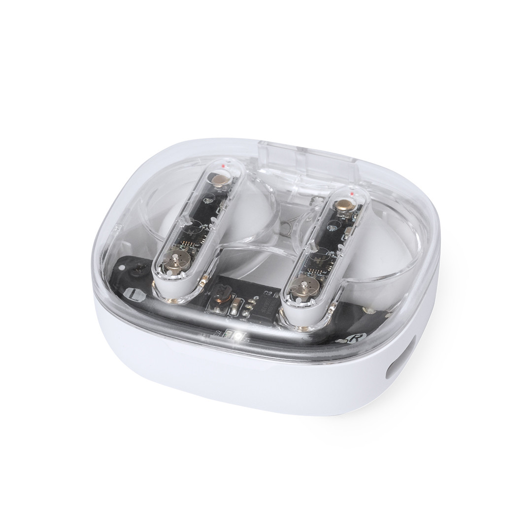 Auriculares intraurales en distintivo diseño transparente. Conexión Bluetooth 5.3 y gran autonomía . De diseño ergonómico, incluyen botón de control táctil integrado en el auricular, con base de carga a juego e indicadores de estado de carga. Función manos libres. Puerto de carga con entrada Tipo C (cable incluido). Presentados en caja individual de diseño kraft y en bolsa reciclada. Conexión Bluetooth. Batería 30 mAh/ Base Carga 200 mAh