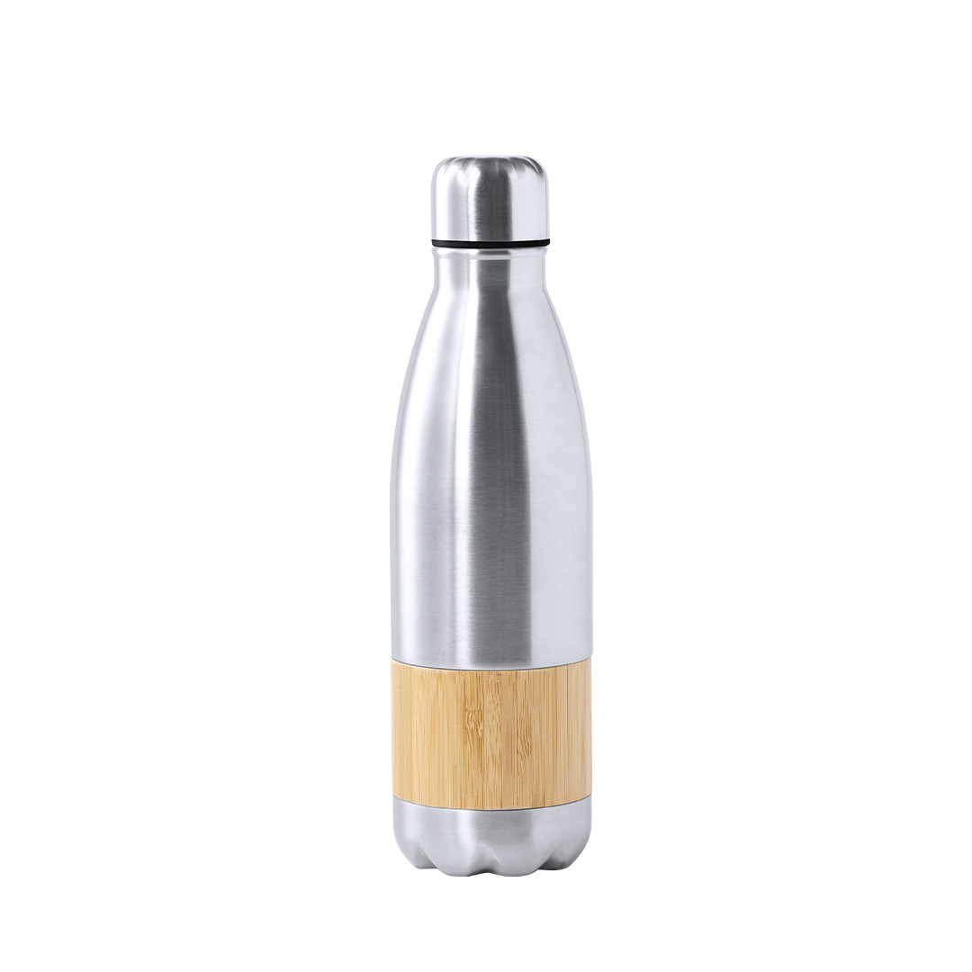 Bidón de línea nature, en combinación de materiales acero inox de acabado mate y bambú. 750ml de capacidad, con tapón de seguridad y presentado en atractiva caja de diseño eco. 750 ml