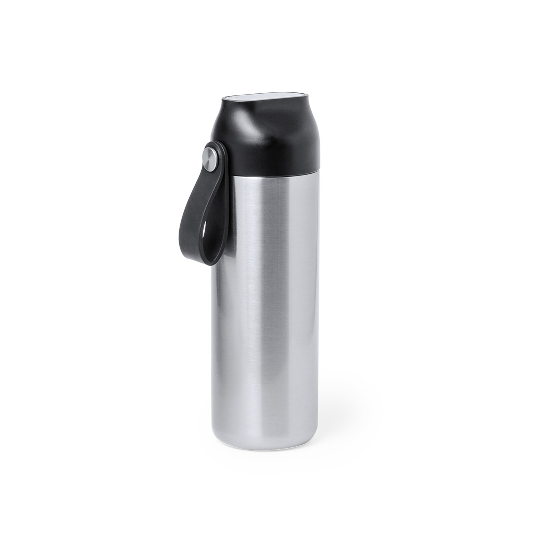 Bidón térmico de acero inox y doble pared de 630 ml de capacidad, con medidor de temperatura táctil en tapón y asa integrada. Con tapón de seguridad libre de BPA y presentado en atractiva caja individual de diseño Kraft y en bolsa reciclada. Alimentación a pilas (de botón incluida), con manual de instrucciones disponible en español e inglés. 630 ml. Medidor Temperatura Táctil