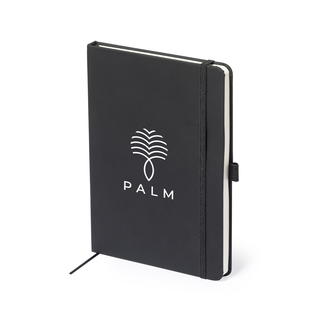 Bloc de notas fabricado en polipiel de elegante acabado en negro. Con tapas duras, marcapáginas y elástico de sujeción a juego. Interior con 100 hojas de disposición a 1 raya y soporte para bolígrafo (bolígrafo no incluido). Portada Rígida. 100 Hojas