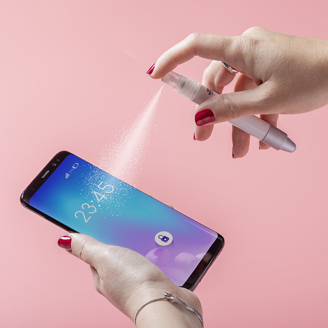 Bolígrafo antibacteriano con pulverizador recargable integrado y capucha protectora con puntero en color gris. Acabado liso en resistente ABS brillante con detalles cromados y escritura en tinta azul. Capacidad del pulverizador 3ml. Líquido no incluido.Los productos con tratamientos antibacterianos son capaces de reducir drásticamente las cargas bacterianas presentes en las superficies de los materiales, gracias a la incorporación de agentes microbianos permanentes estáticos, con alta efectividad para inhibir y prevenir la contaminación bacteriana.Artículo de acuerdo al estándar ISO 22196, que determina la actividad antibacteriana en materiales plásticos y superficies no porosas, lo que permite conocer la efectividad de inhibición microbiana que tienen los aditivos sobre los objetos tratados mediante una evaluación cuantitativa. 3 ml. Líquido No Incluido