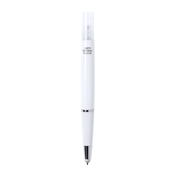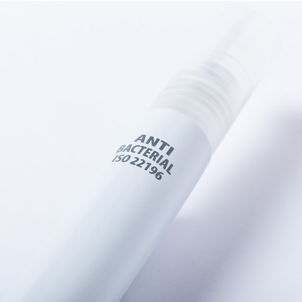 Bolígrafo antibacteriano con pulverizador recargable integrado y capucha protectora, incluye puntero en color gris. Acabado liso en resistente ABS brillante con elegante clip metálico y escritura en tinta azul. Capacidad del pulverizador 3ml. Líquido no incluido.Los productos con tratamientos antibacterianos son capaces de reducir drásticamente las cargas bacterianas presentes en las superficies de los materiales, gracias a la incorporación de agentes microbianos permanentes estáticos, con alta efectividad para inhibir y prevenir la contaminación bacteriana.Artículo de acuerdo al estándar ISO 22196, que determina la actividad antibacteriana en materiales plásticos y superficies no porosas, lo que permite conocer la efectividad de inhibición microbiana que tienen los aditivos sobre los objetos tratados mediante una evaluación cuantitativa. 3 ml. Líquido No Incluido