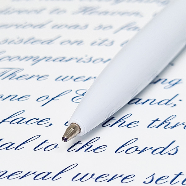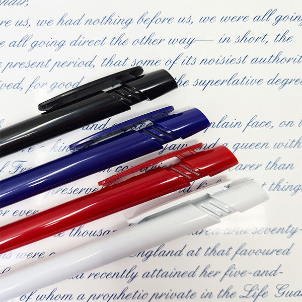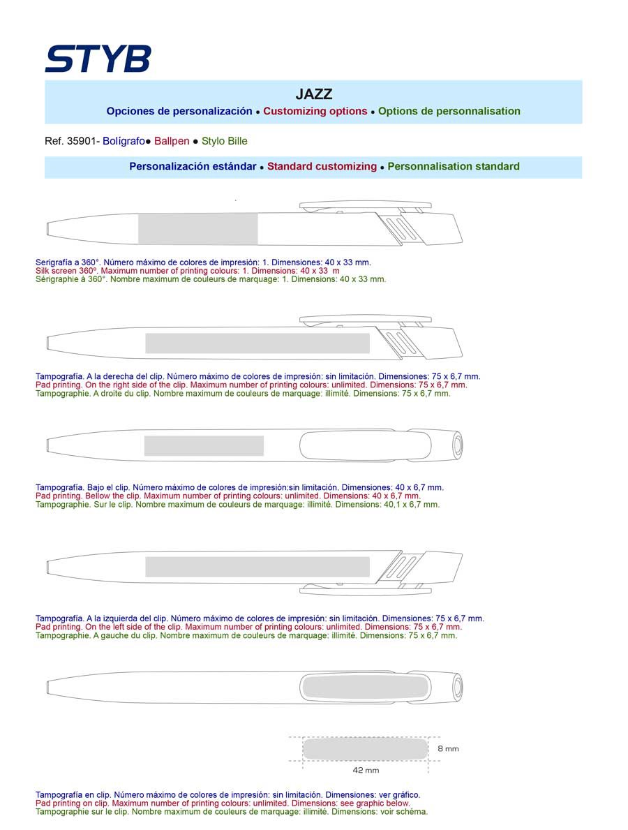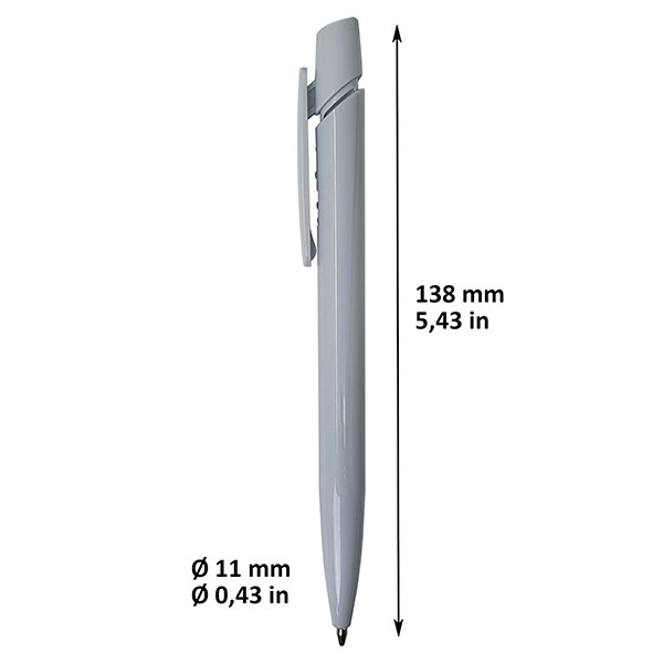 Bolígrafo económico con grandes posibilidades de impresión publicitaria en cuerpo y en clip. Diseñado en España. Tinta azul. Impresión en tampografía a un color en una posición, preguntar precio para otras posiciones y serigrafía circular.