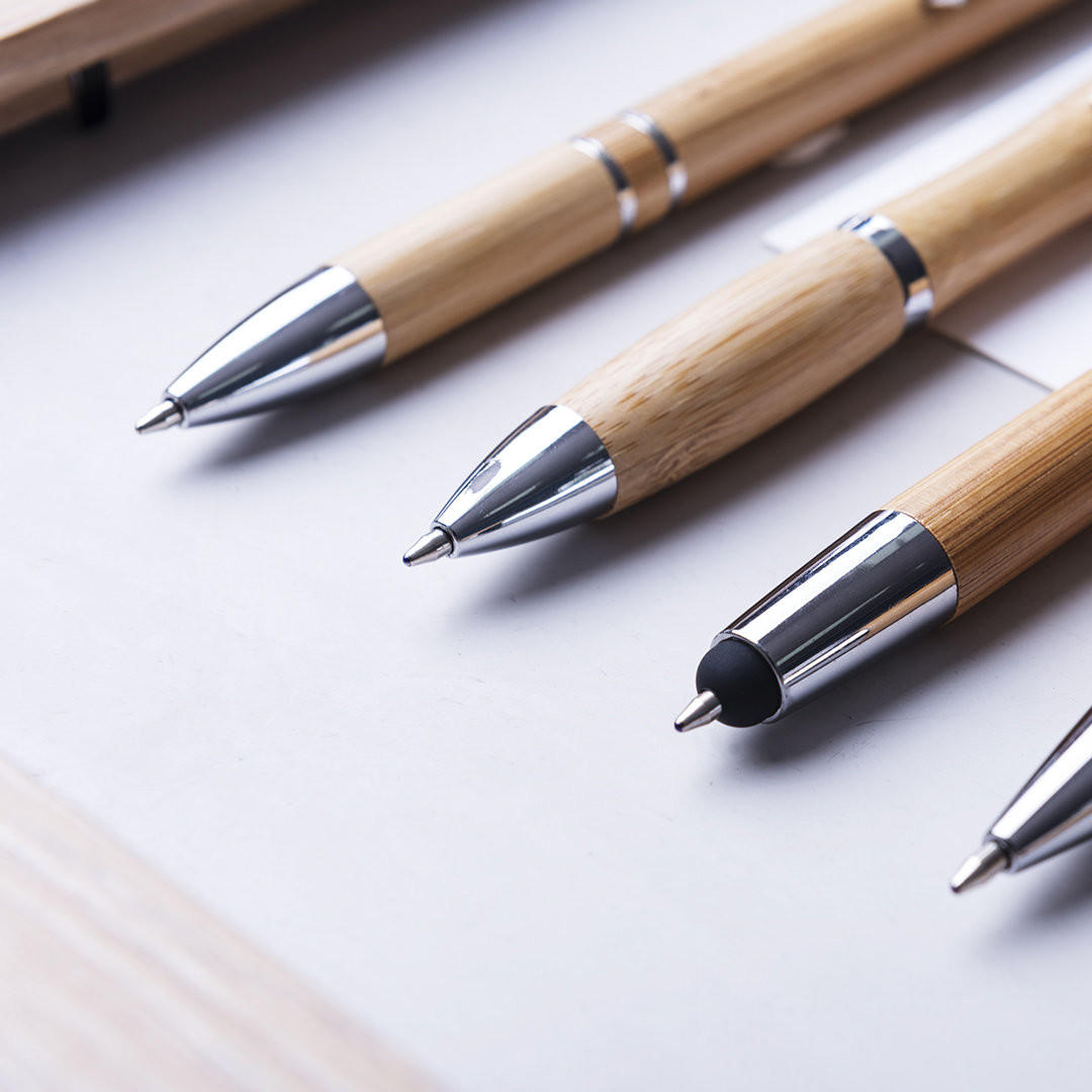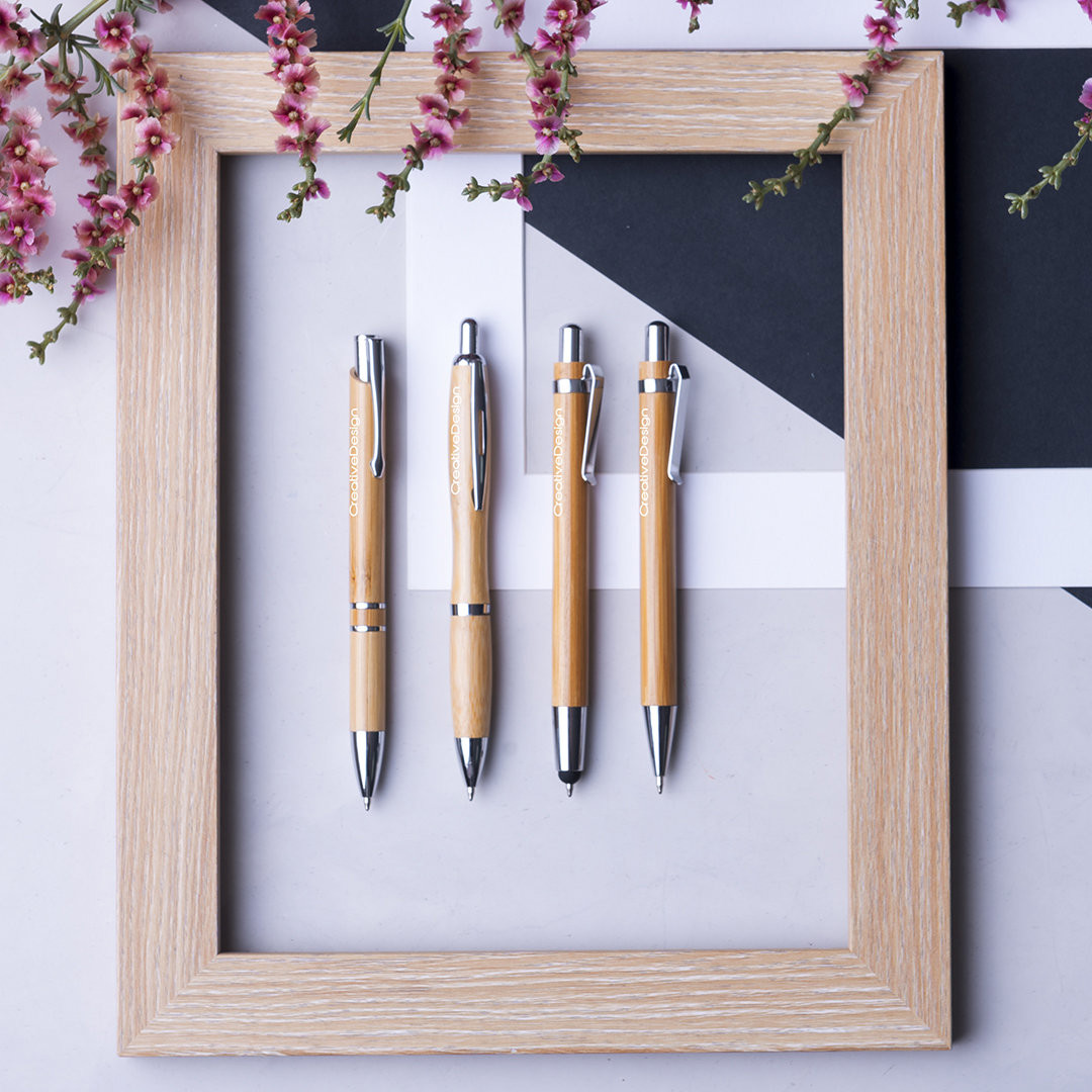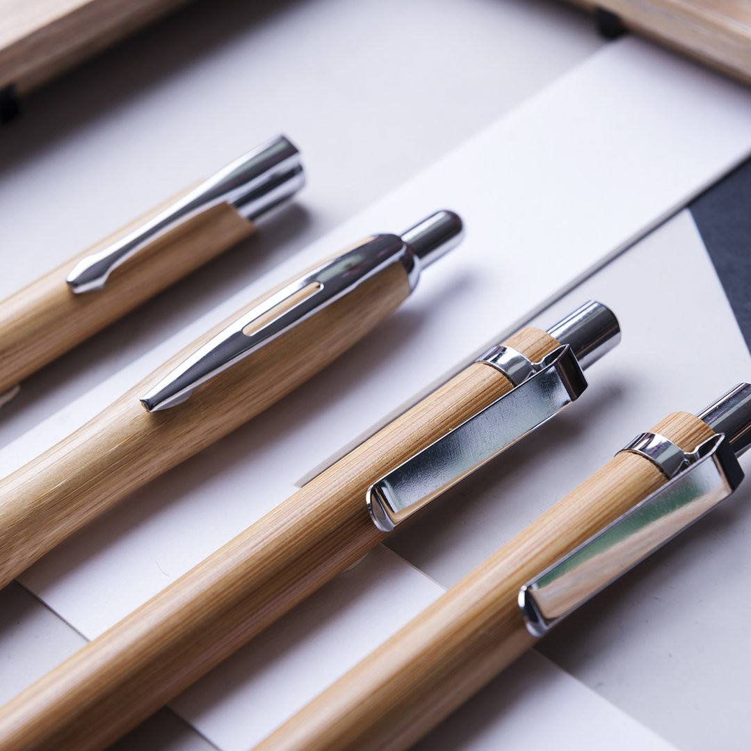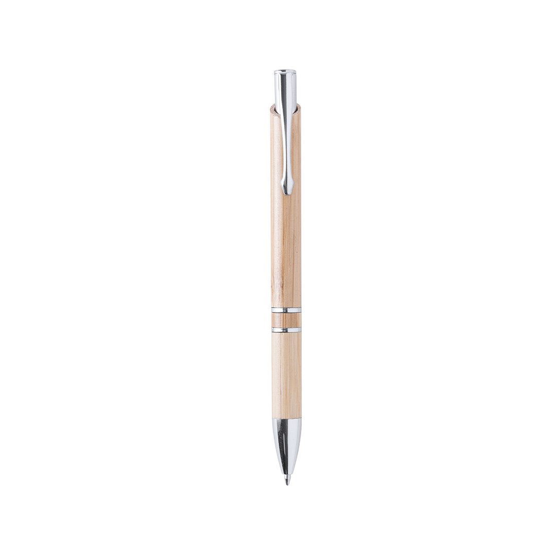 Bolígrafo de línea nature con cuerpo en madera de bambú. De mecanismo pulsador, con clip troquelado y detalles en acabado cromado. De cartucho jumbo y tinta negra. Carga Jumbo. Tinta Negra