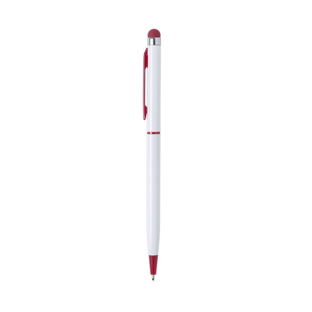 Bolígrafo puntero de mecanismo giratorio con cuerpo en aluminio de color blanco y accesorios en variada gama de vivos colores. Con clip troquelado y tinta azul.
