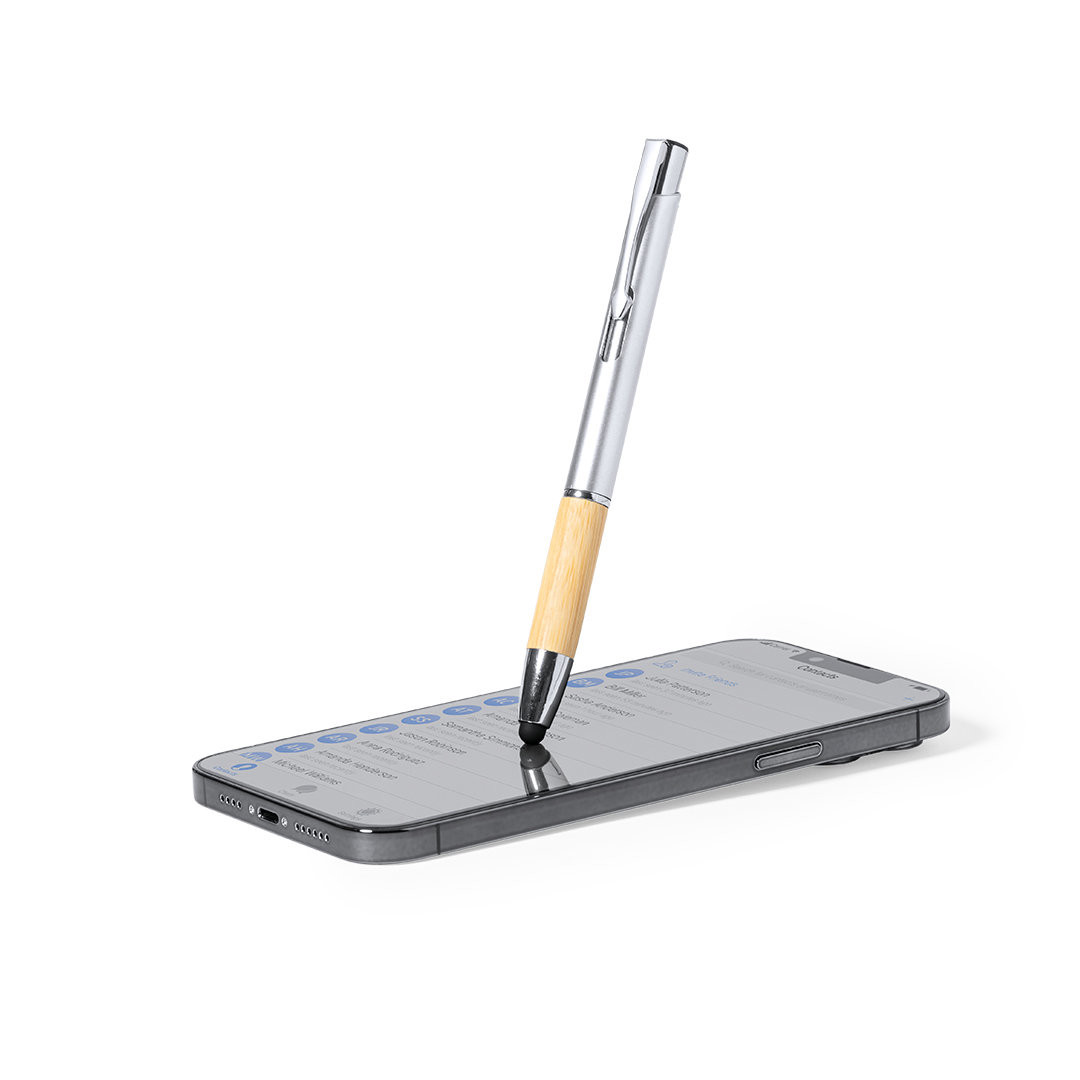 Elegante bolígrafo puntero de línea nature y mecanismo pulsador. Cuerpo en resistente ABS de acabado brillo y empuñadura en bambú, con accesorios a juego. Clip metálico, con cartucho jumbo y en tinta azul. Carga Jumbo