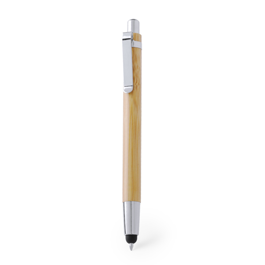 Elegante bolígrafo puntero de mecanismo pulsador con cuerpo en madera de bambú natural y accesorios de acabado metálico en color plateado brillante. De cartucho jumbo y tinta azul. Carga Jumbo