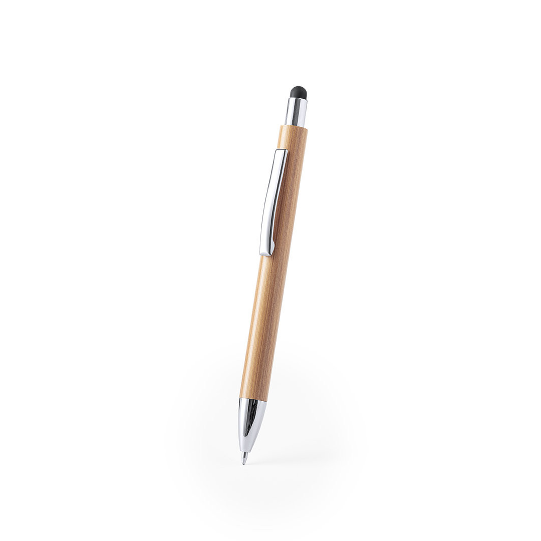 Bolígrafo puntero de línea nature, con cuerpo en bambú y accesorios cromados, con puntero en negro. De mecanismo pulsador, clip metálico y cartucho jumbo con tinta azul. Carga Jumbo