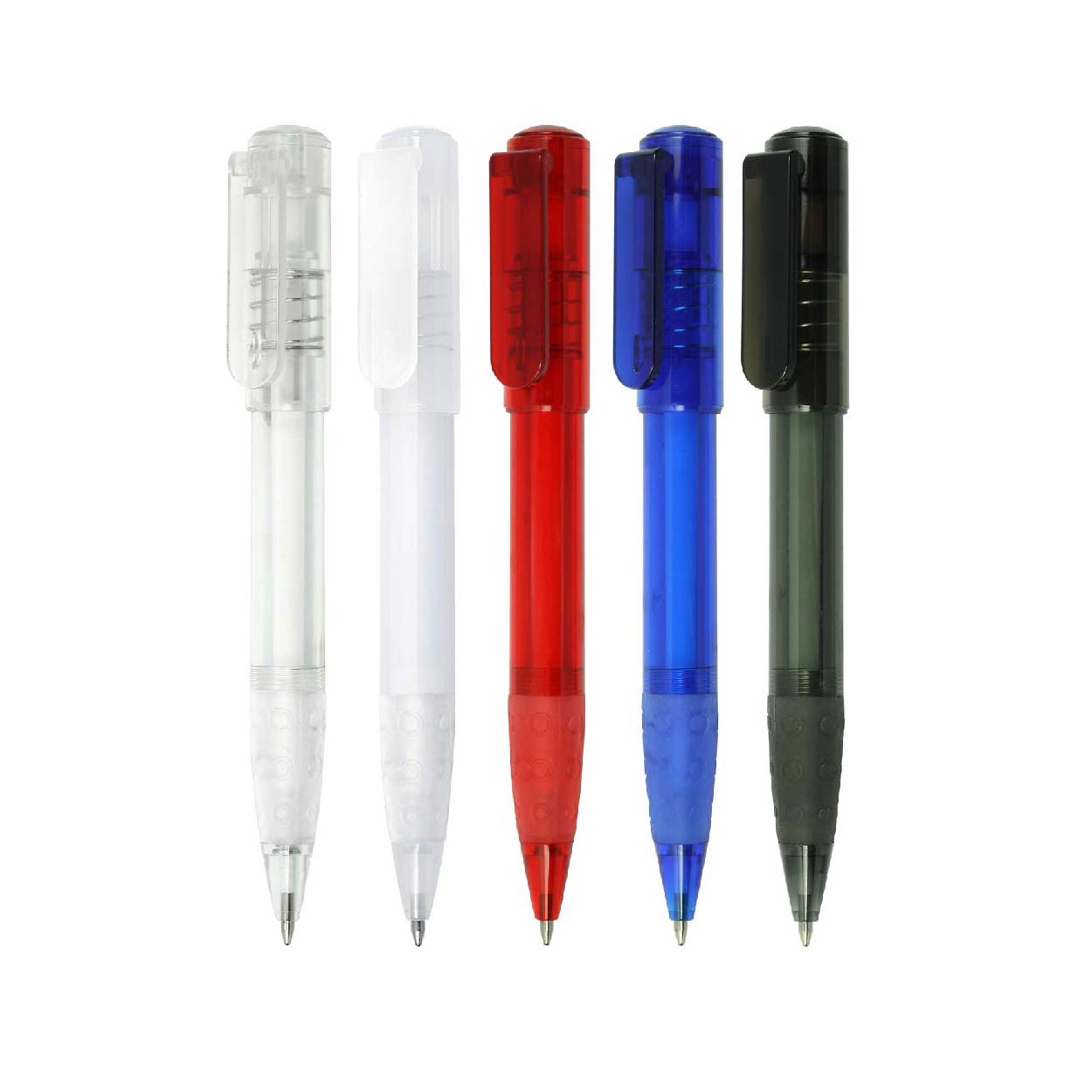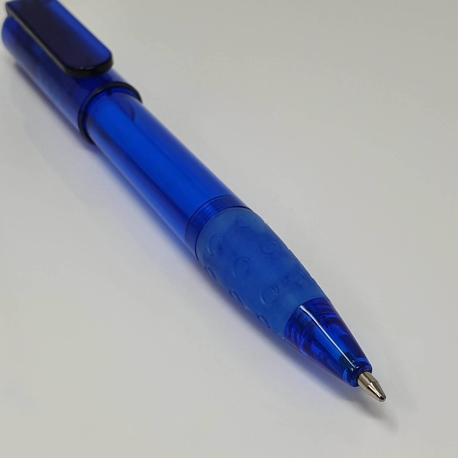 Modernos colores translúcidos y transparentes. Sujeción de caucho para cómoda escritura. Diseñado en España. Tinta azul. fluida. Preguntar precios marcajes especiales.