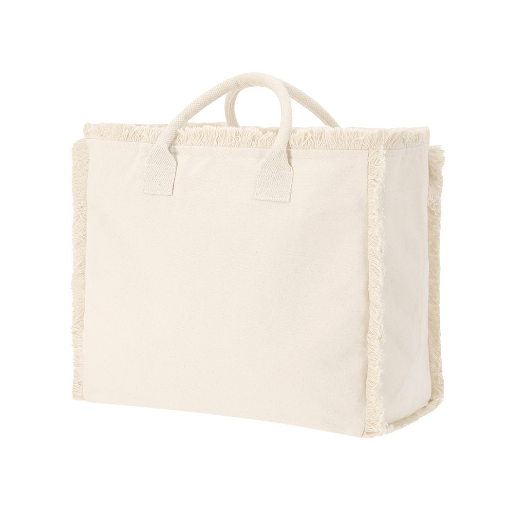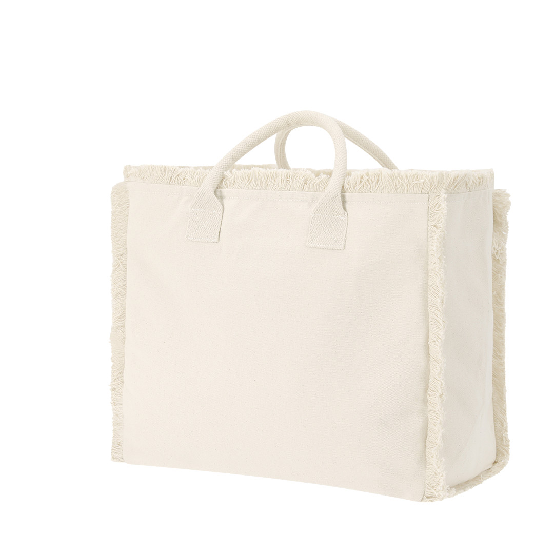 Bolsa con estilo flecos confeccionada principalmente en algodón de 360 g/m2. De práctico y moderno diseño, incorpora asas cortas reforzadas. Incluye cierre de cremallera para mayor seguridad y bolsillo interior con cremallera.