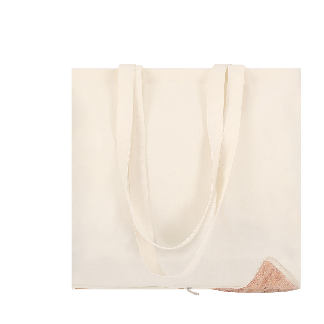 Bolsa plegable de línea nature en combinación de materiales 100% algodón de 110 g/m2 y base en corcho natural, con bolsillo. Asas de 57 cm con refuerzo, de acabado cosido y resistencia hasta 8 kg de peso. Plegado de pequeño tamaño mediante cremallera para un fácil transporte.