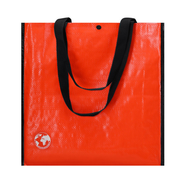 Bolsa reutilizable en resistente material laminado. Con asas largas reforzadas en nylon de 70cm, fuelle reforzado con ribetes y cierre de corchete. De acabado cosido y resistencia hasta 12kg de peso. Disponible en gama de colores brillantes. Biodegradable