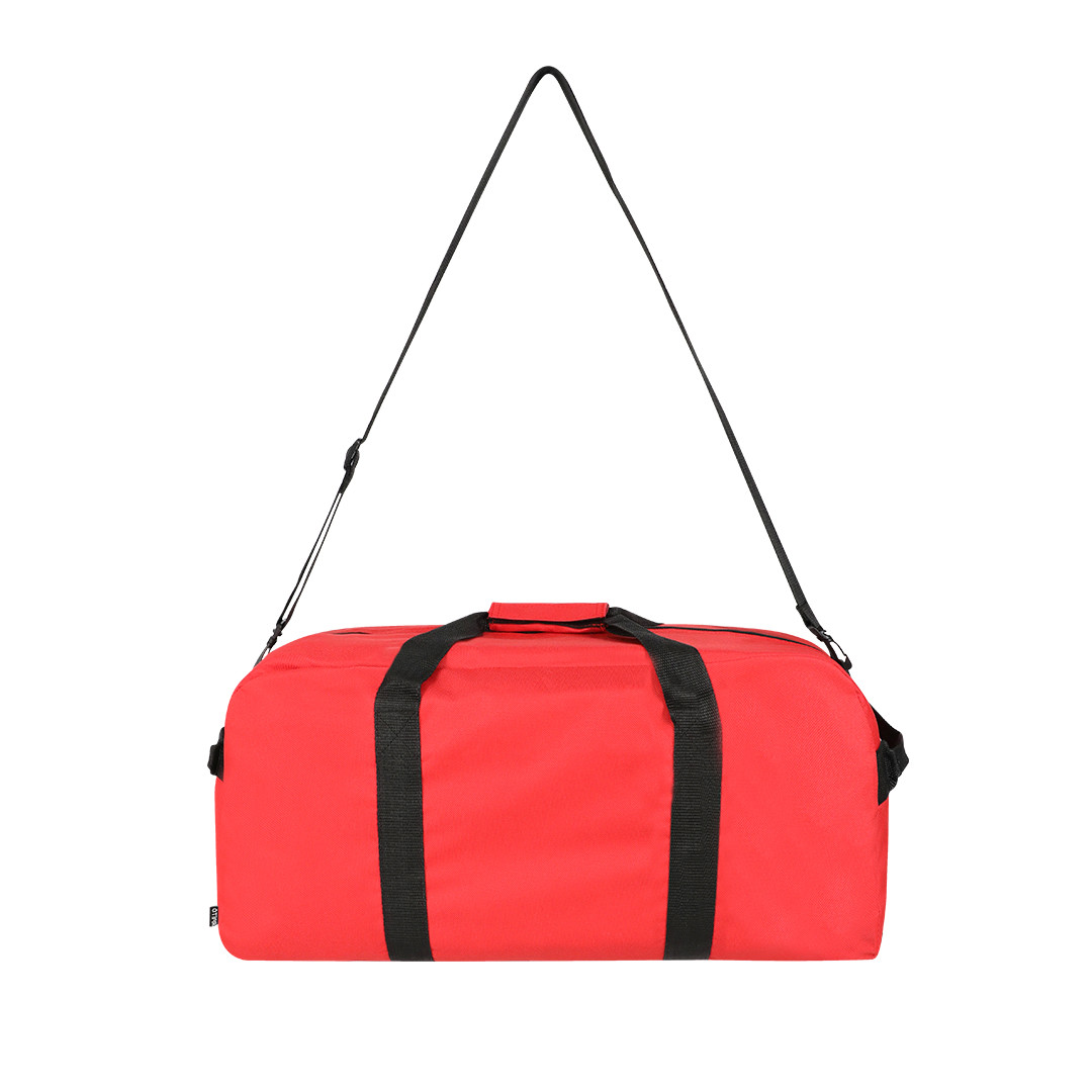 Bolso fabricado en resistente poliéster RPET 600D. Compartimento principal con cierre de cremallera de doble tirador y bolsillo exterior con cierre de cremallera con tirador. Con sas reforzadas alrededor del cuerpo en color negro y empuñadura acolchada a color. Incluye asa de transporte en lateral y cinta bandolera ajustable de doble anclaje de mosquetón. El material RPET se elabora a partir de plástico reciclado, para así fomentar la reutilización de residuos plásticos y ayudar a la sostenibilidad del planeta.