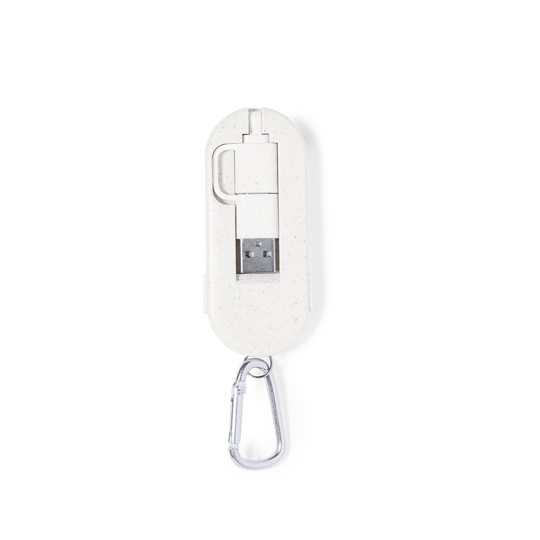 Cable cargador con mosquetón fabricado en fibra de trigo y bambú. Con conexiones de entrada Tipo C y USB y salidas Tipo C, lightning y Micro USB. 5V DC 2A. Presentado en bolsa individual de diseño kraft.Elaborado con elementos vegetales para así fomentar la utilización de materias primas naturales y reducir las emisiones contaminantes. Conexión Micro USB, Tipo C y Lightning 5V DC 2A