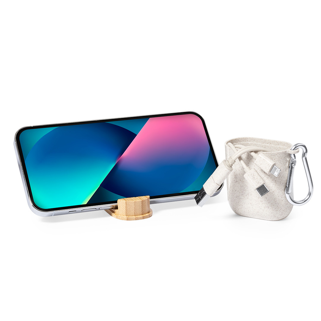 Cable cargador fabricado en fibra de trigo. Con conexiones de entrada Tipo C y USB y salidas Tipo C, Lightning y Micro USB. 5V DC 2.4A. Presentado en elegante estuche de diseño fabricado en fibra de trigo y tapadera de cierre en bambú, con función soporte para smartphones. Elaborado con elementos vegetales para así fomentar la utilización de materias primas naturales y reducir las emisiones contaminantes. Conexión Micro USB, Tipo C y Lightning 5V DC 2.4A