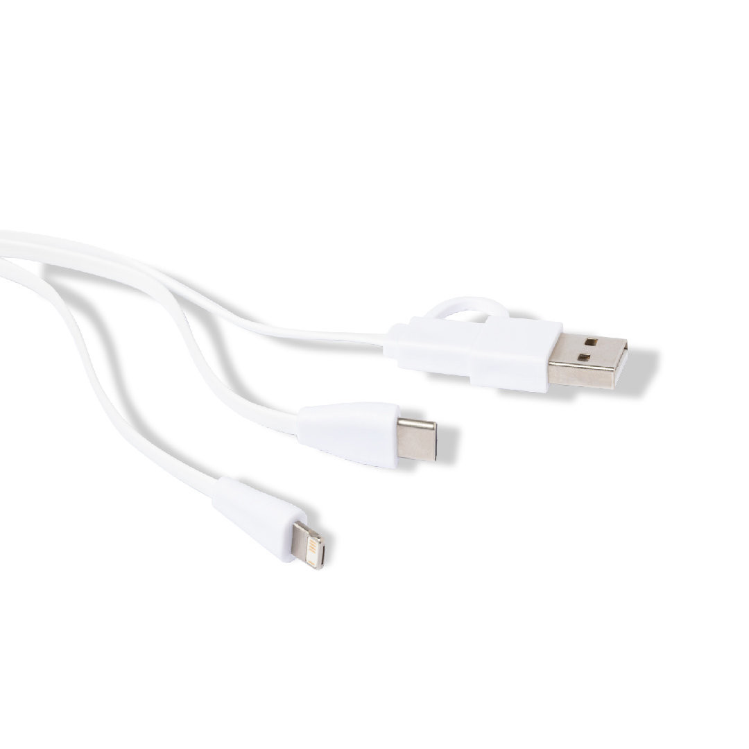 Cable cargador con llavero, fabricado en bambú y con detalle en extracto de mármol. Incluye conexiones de entrada USB y Tipo C, con salidas Lightning, Micro USB y Tipo C 5VDC 2.4A. Presentado en bolsa individual de diseño kraft. Conexión Micro USB, Tipo C y Lightning 5V DC 2.4A
