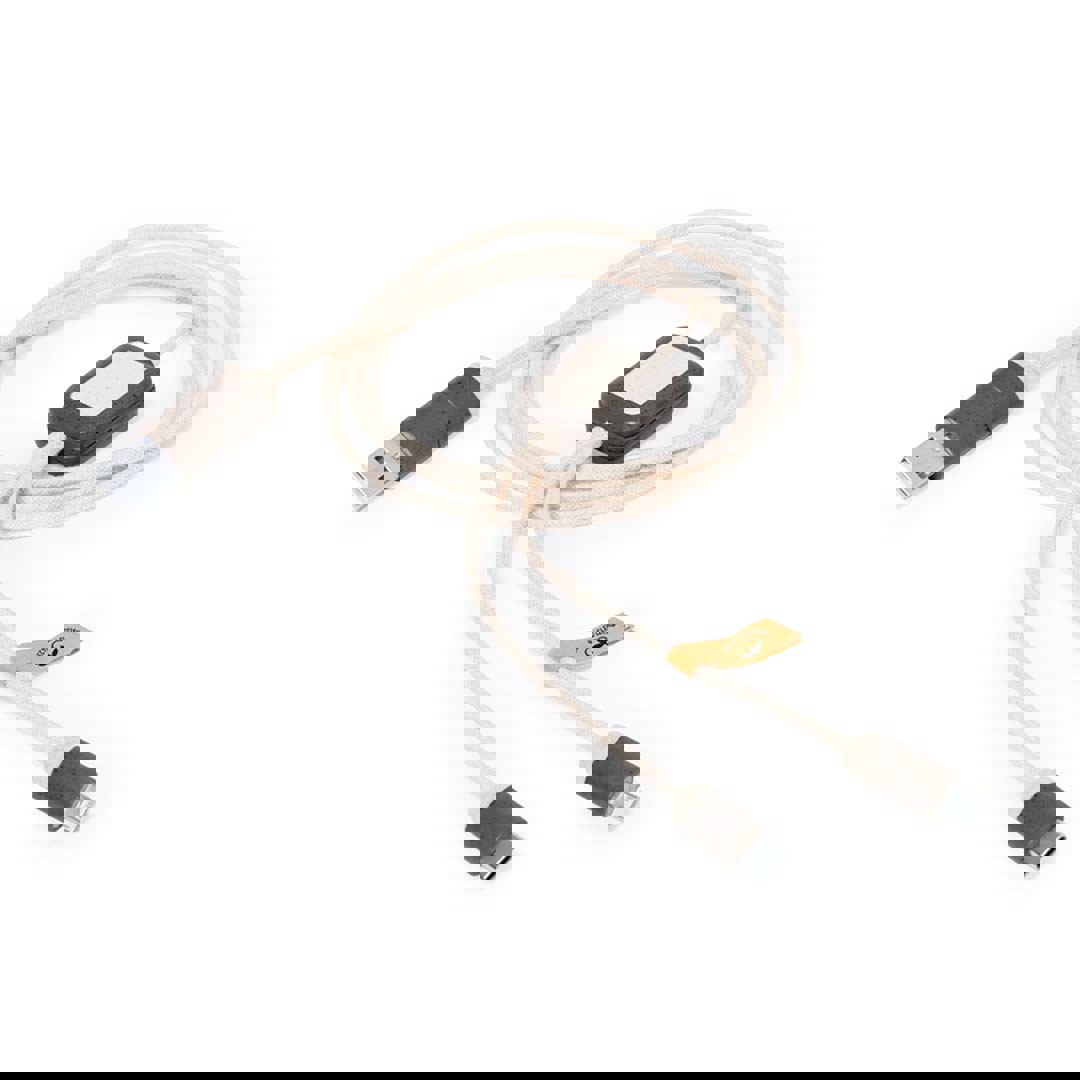 Cable cargador fabricado en fibra de café, con cables recubiertos en algodón reciclado. Conexiones de entrada Tipo C y USB, con salidas Tipo C, Lightning y Micro USB. 5V DC 2.4A. Con distintivos de fibra de café y algodón reciclado. Presentado en bolsa individual de diseño kraft con autocierre.La fibra de café es una solución circular que se obtiene de la utilización de los residuos producidos en la obtención del café. Una alternativa sostenible que favorece la reducción del uso de plásticos, ahorrando energía en su proceso de fabricación y contribuyendo al cuidado del medio ambiente. Disponible certificación GRS (Global Recycled Standard / Estándar de Reciclaje Global), que garantiza el origen reciclado del material usado para fabricar el producto. Conexión Micro USB, Tipo C y Lightning 5V DC 2.4A