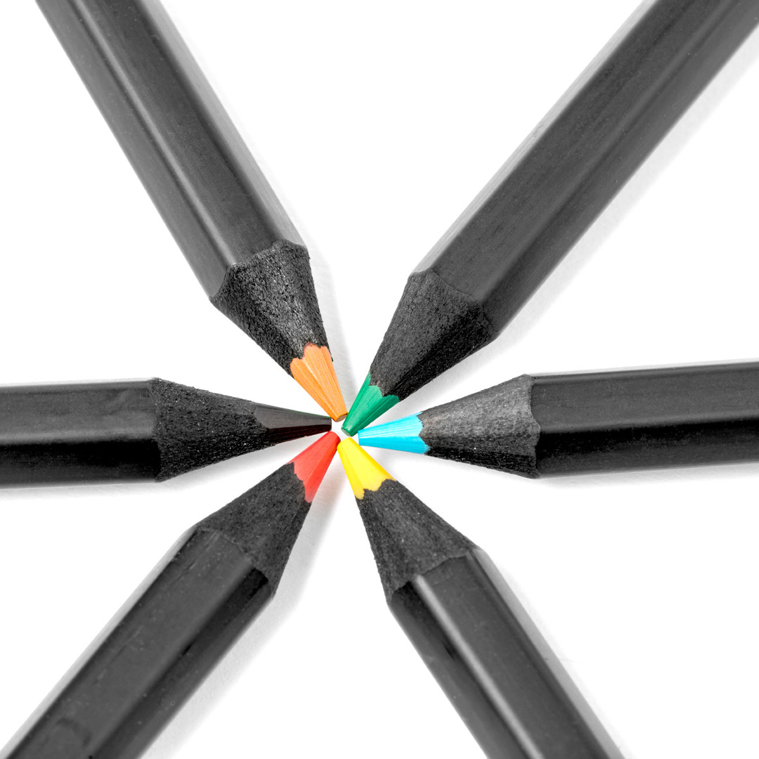 Set de 6 lápices de madera acabada en color negro, con cuerpo hexagonal y minas en varios colores. Presentados en estuche negro de cartón reciclado negro con cierre de solapa. 6 Lápices