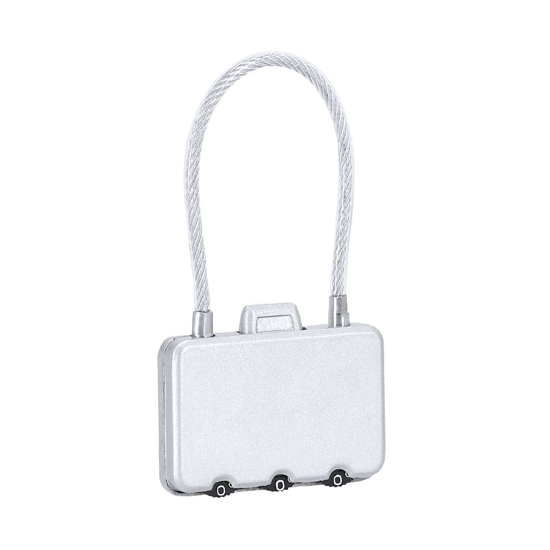 Candado con contraseña numérica metálico de 3 dígitos, botón de apertura en la parte superior y cierre de cable de acero.