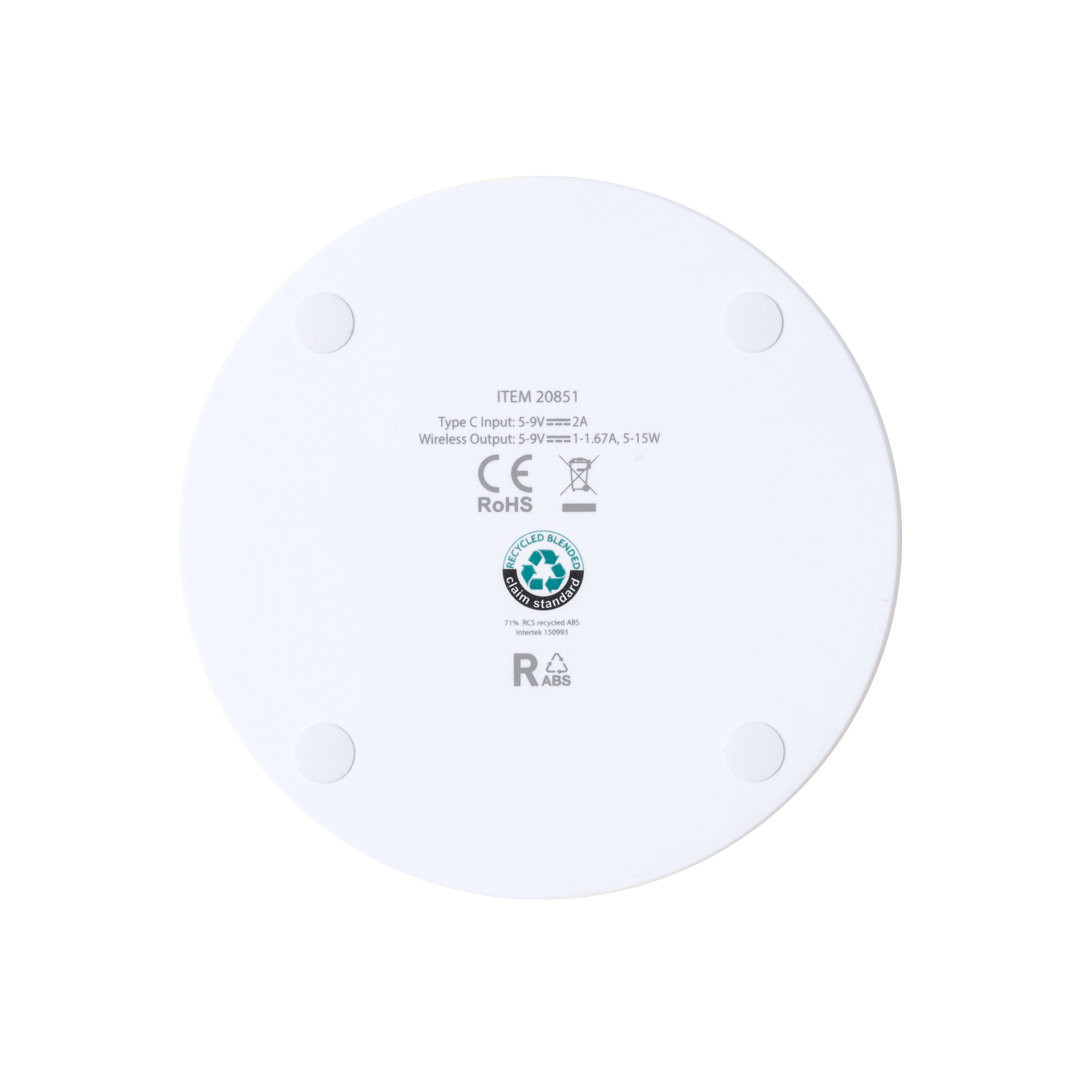 Cargador inalámbrico 15W de diseño circular fabricado en RABS. Compatible con dispositivos equipados con tecnología de carga inalámbrica Qi. Base antideslizante, con cable cargador Tipo C incluido. Presentado en caja individual de diseño kraft, con manual de instrucciones en español e inglés.El RABS es un plástico altamente reciclable de gran resistencia y con multitud de aplicaciones que lo convierten en una solución eco-friendly. Con certificación RCS, que garantiza el origen reciclado del mismo.Fabricado conforme a los estándares RoHS y en cumplimiento con los siguientes requisitos de seguridad:Sistema de protección contra sobrecalentamiento.Sistema de protección contra sobrecarga.Sistema de bloqueo para evitar cortocircuitos. Inalámbrico 15W