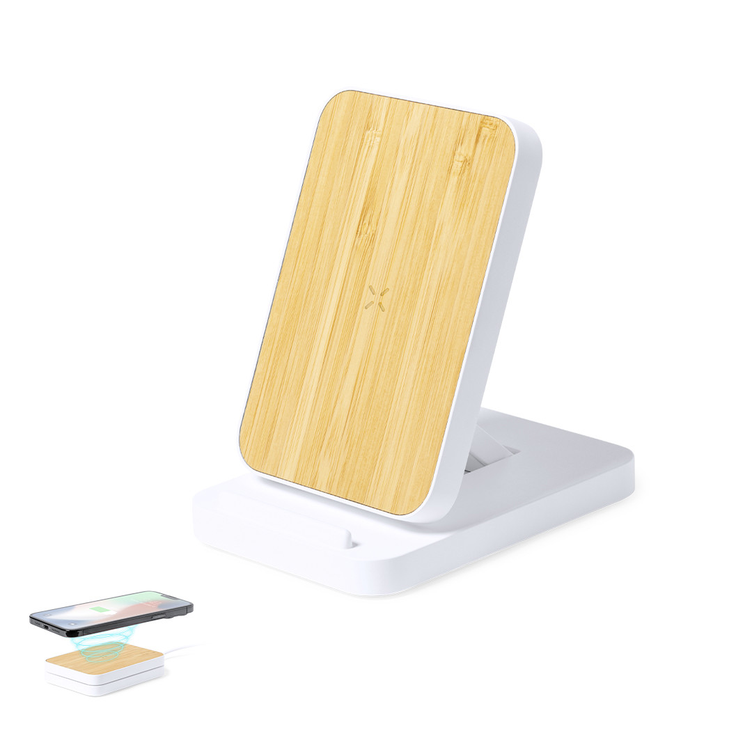 Cargador inalámbrico plegable 15W. Con base fabricada en resistente ABS de color blanco y superficie de carga en bambú, con soporte telescópico integrado. Compatible con dispositivos equipados con tecnología de carga inalámbrica Qi, con cable de carga Tipo C incluido. Presentado en caja individual de diseño kraft, con manual de instrucciones en español e inglés. Fabricado conforme a los estándares RoHS y en cumplimiento con los siguientes requisitos de seguridad: Sistema de protección contra sobrecalentamiento. Sistema de protección contra sobrecarga. Sistema de bloqueo para evitar cortocircuitos. Inalámbrico 15W. Plegable
