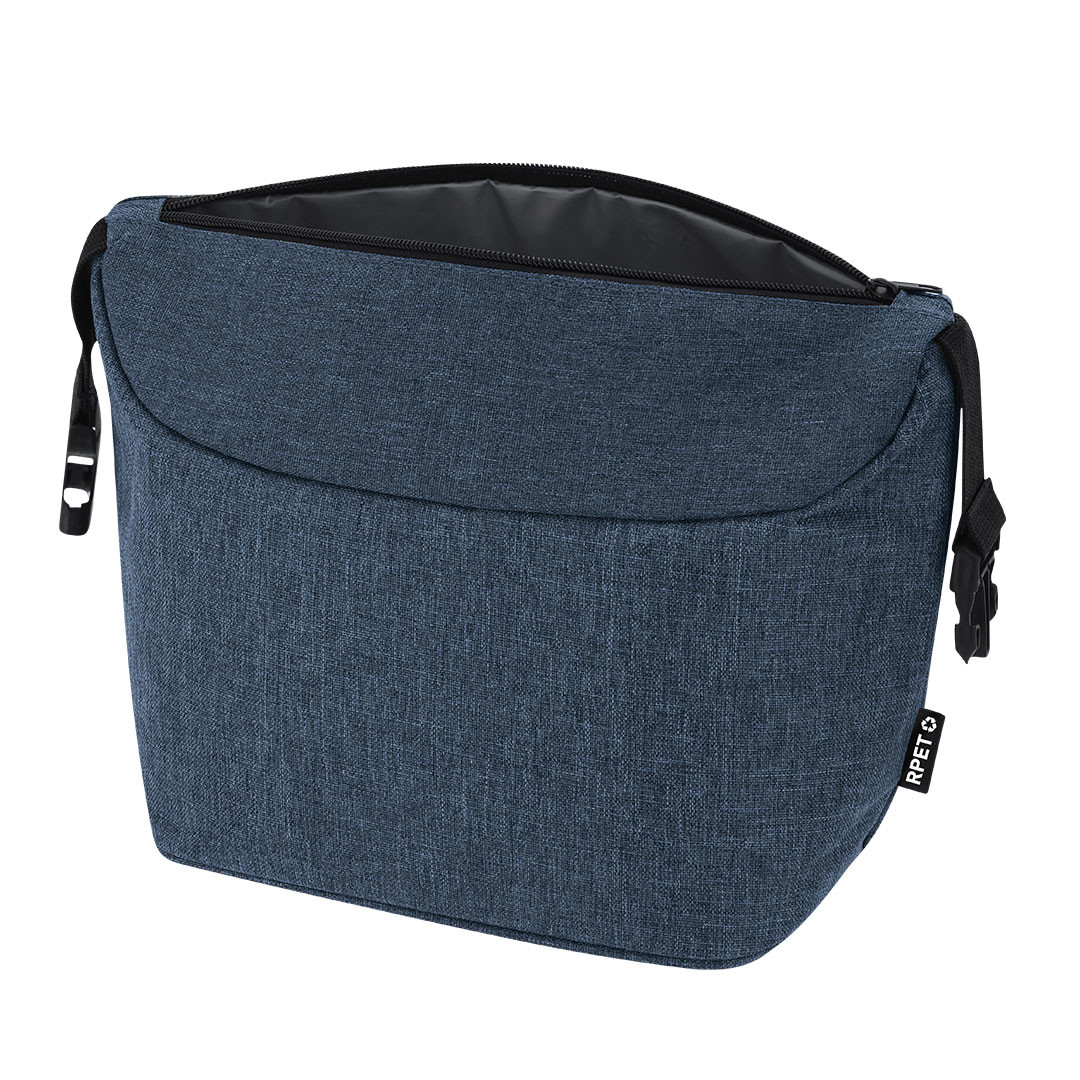 Bolsa nevera en resistente non-woven de acabado laminado brillante y cierre de velcro. Con cómodas asas de transporte en nylon a juego e interior isotermo en acabado de aluminio. Resistencia hasta 7kg de peso.
