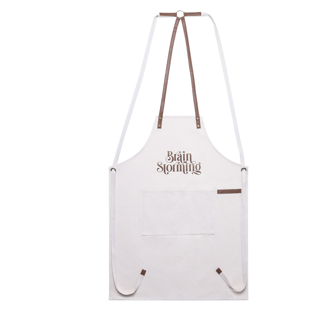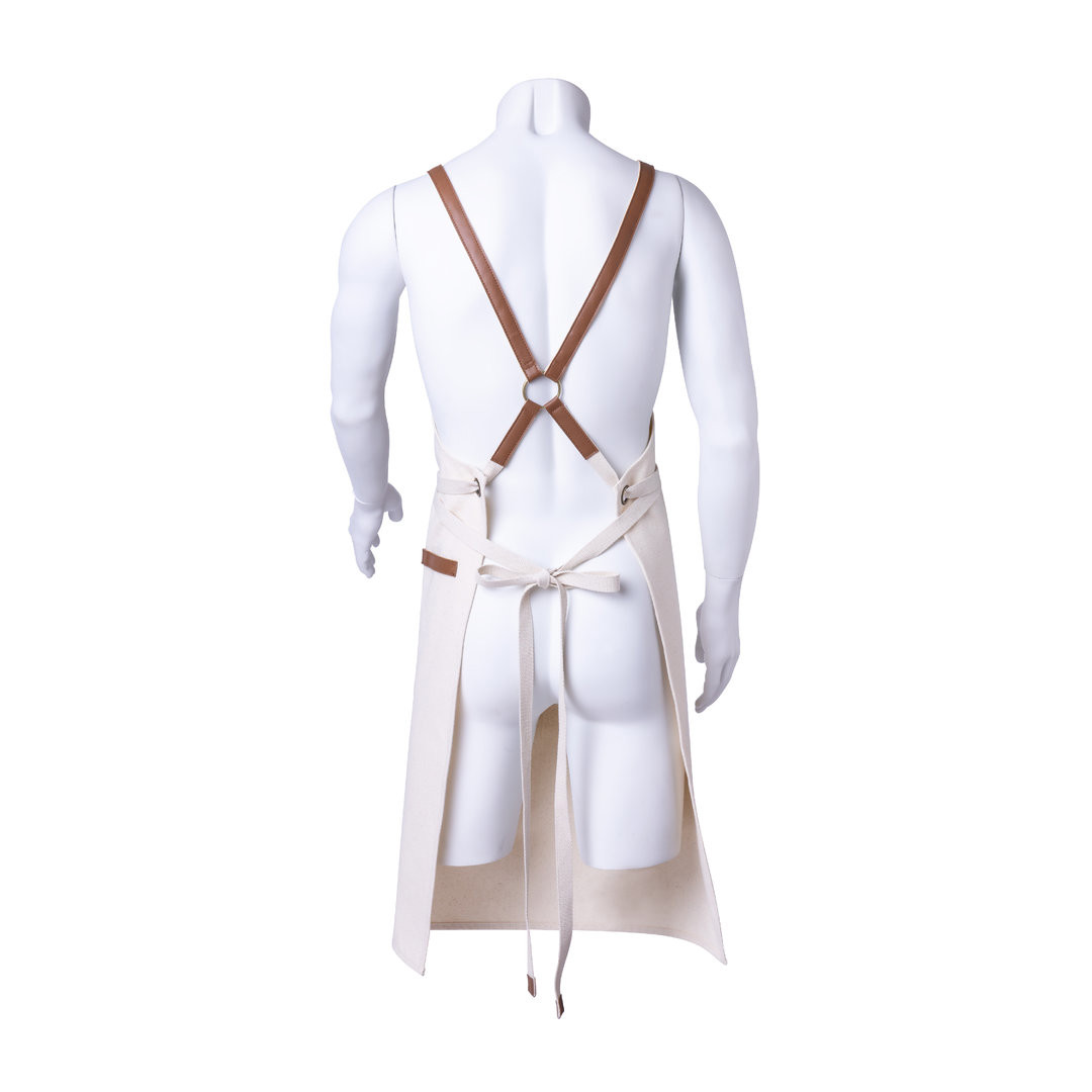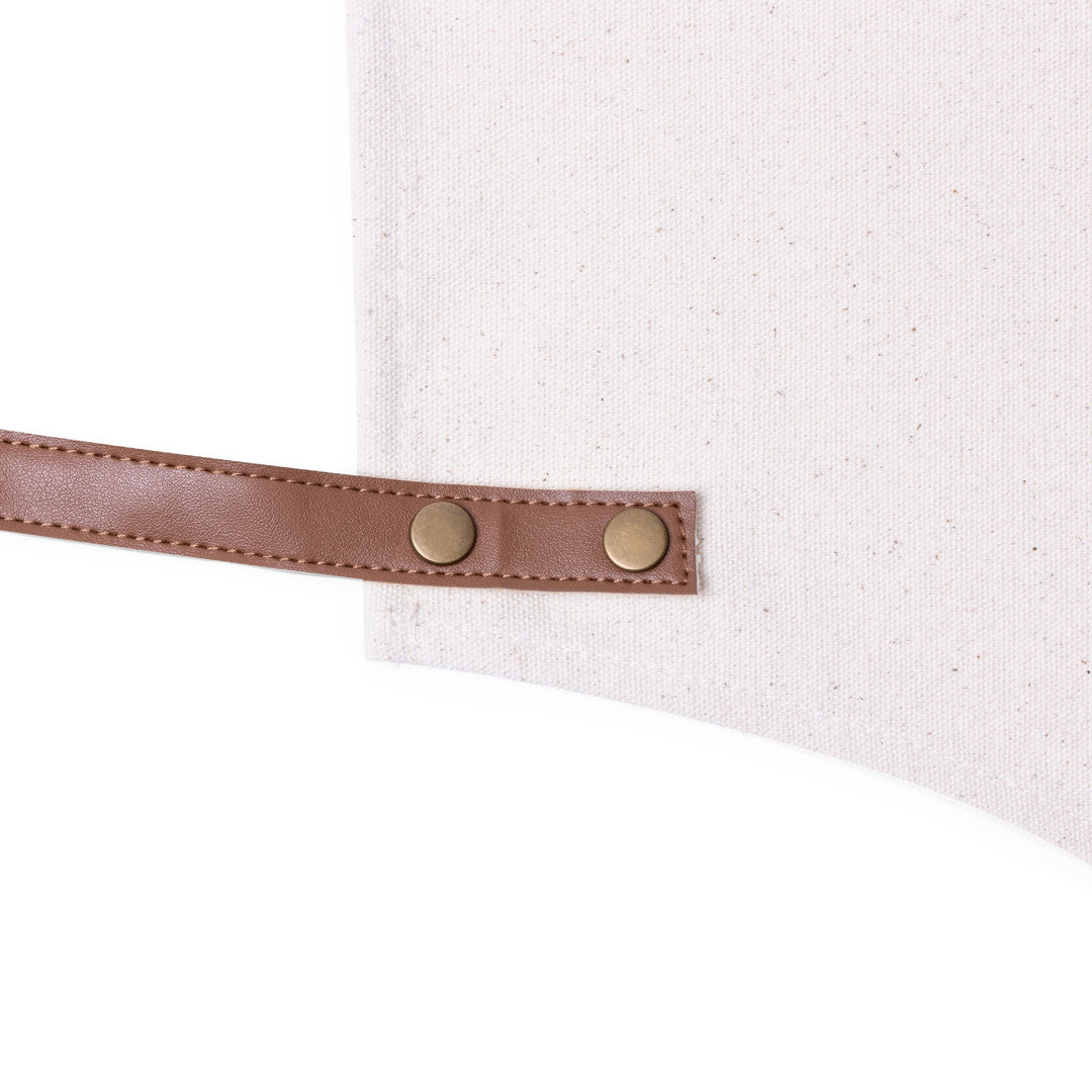 Delantal de alta calidad en resistente material 100% algodón canvas de 340g/m2, con costuras reforzadas. De corte por debajo de la rodilla, con cintas en resistente polipiel y triple ajuste: cuello, espalda y cintura. Con bolsillo frontal, accesorio en polipiel y remaches metálicos de refuerzo.