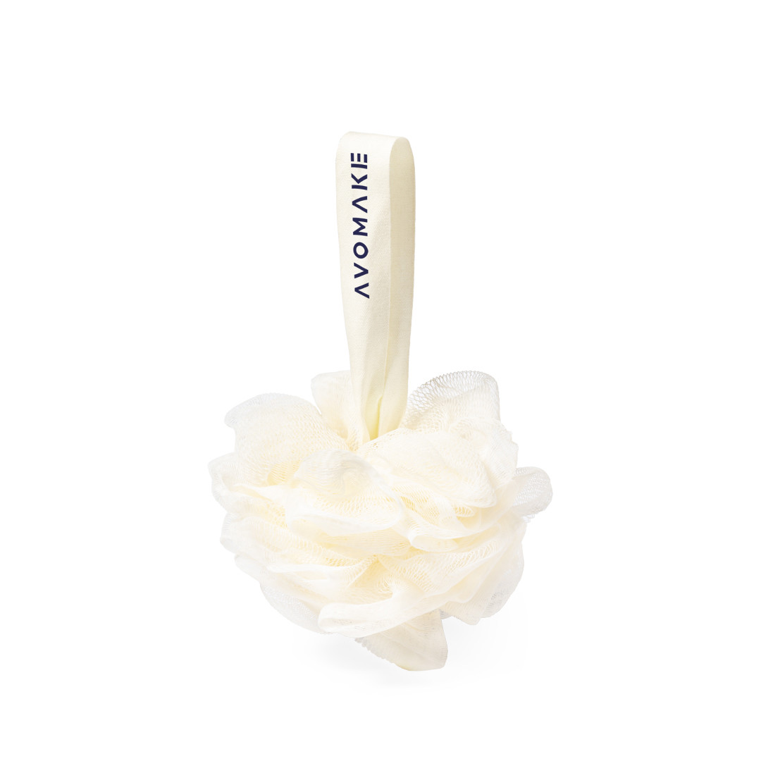 Suave esponja de baño en fibra de PE, con cinta de sujeción a juego y amplia superficie de marcaje.
