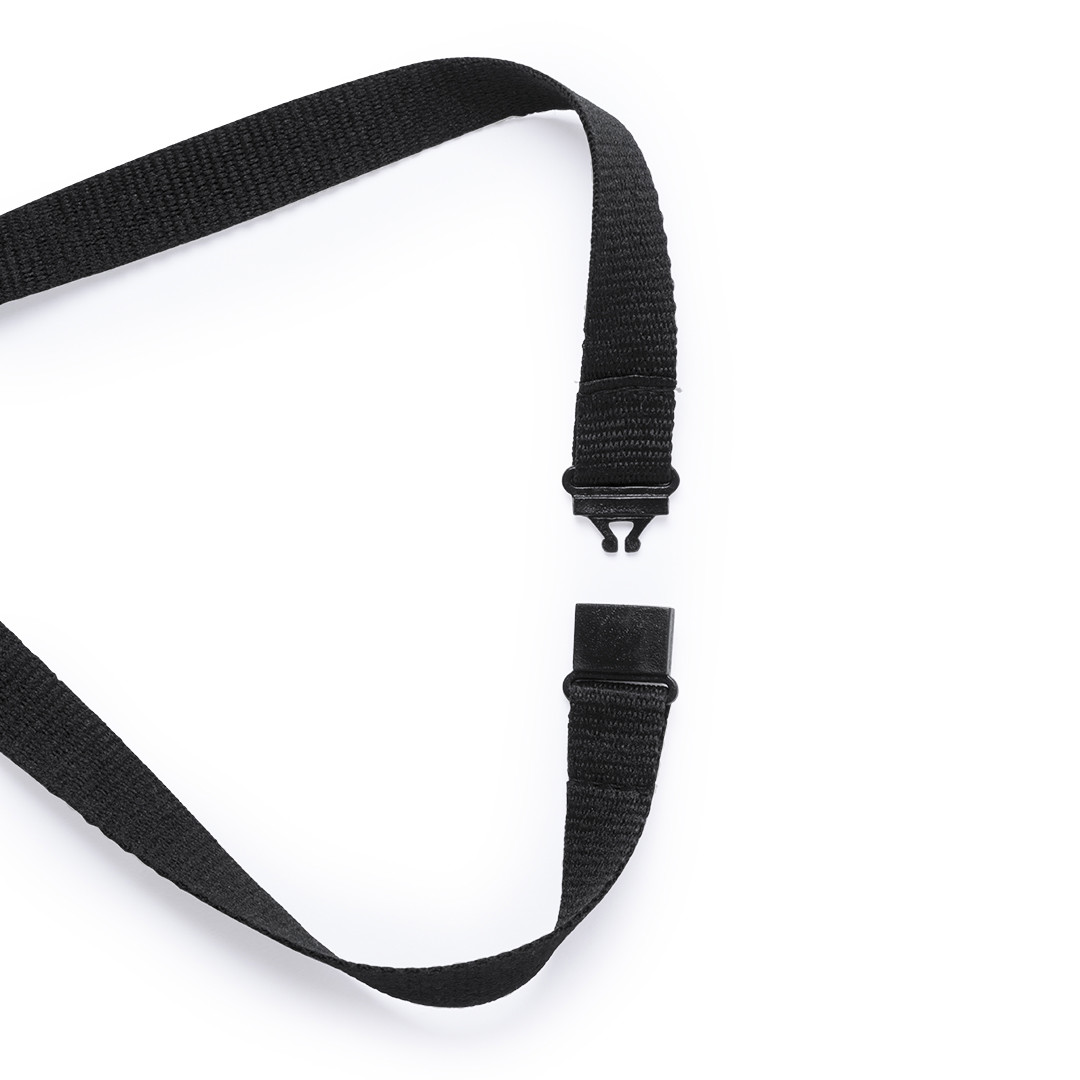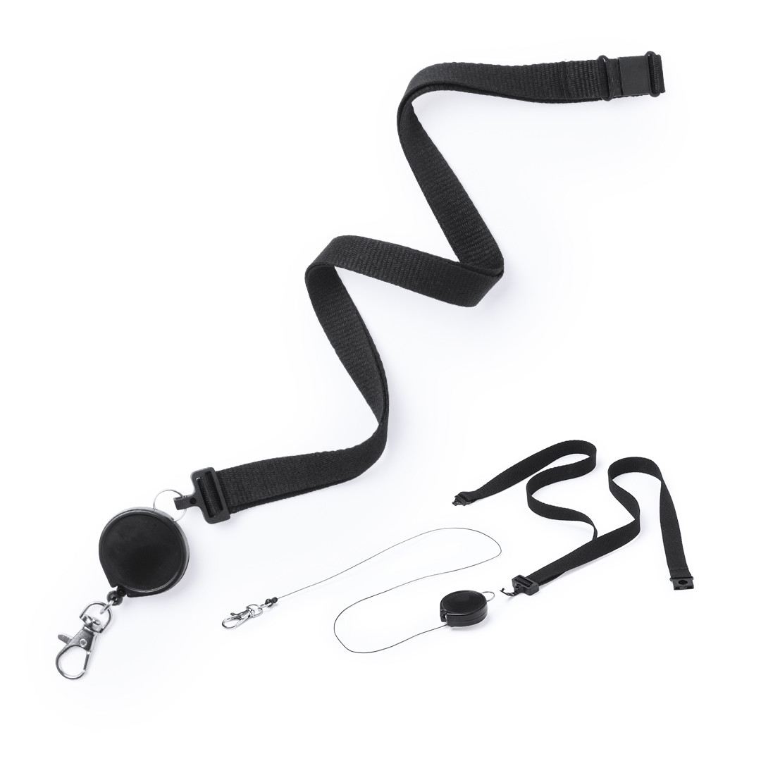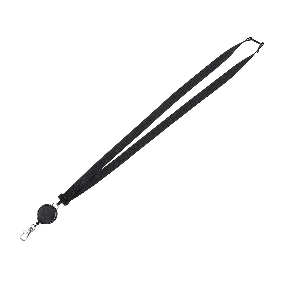 Identificador en PVC con lanyard a juego en vivos colores y con cierre de mosquetón. Pastilla circular para marcaje.
