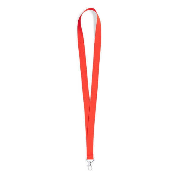Identificador en PVC con lanyard a juego en vivos colores y con cierre de mosquetón. Pastilla circular para marcaje.