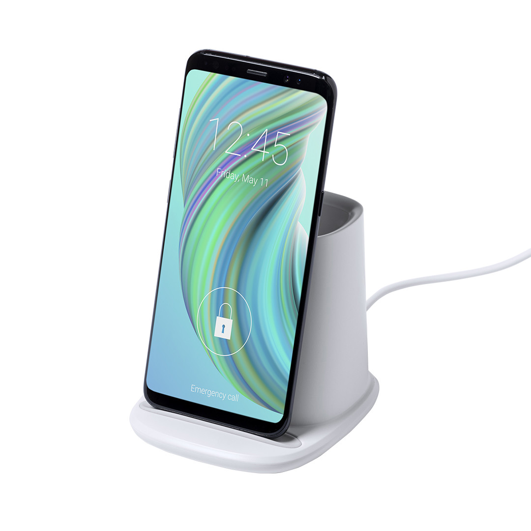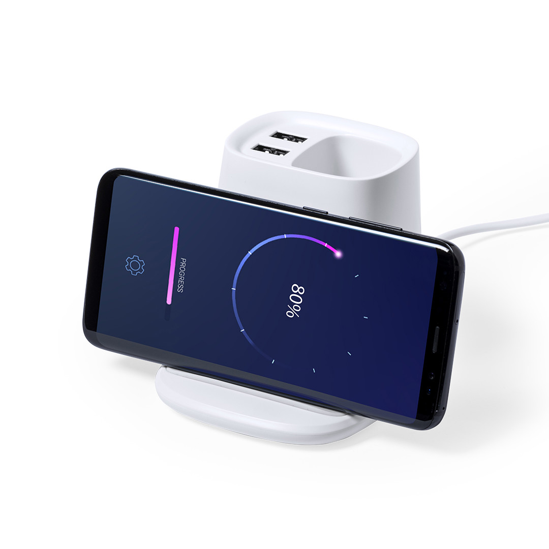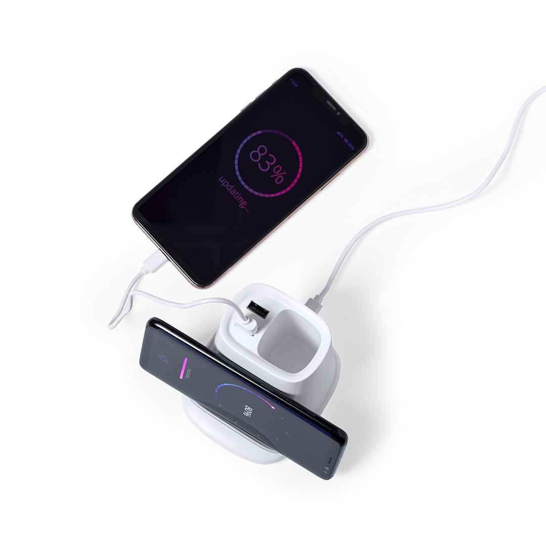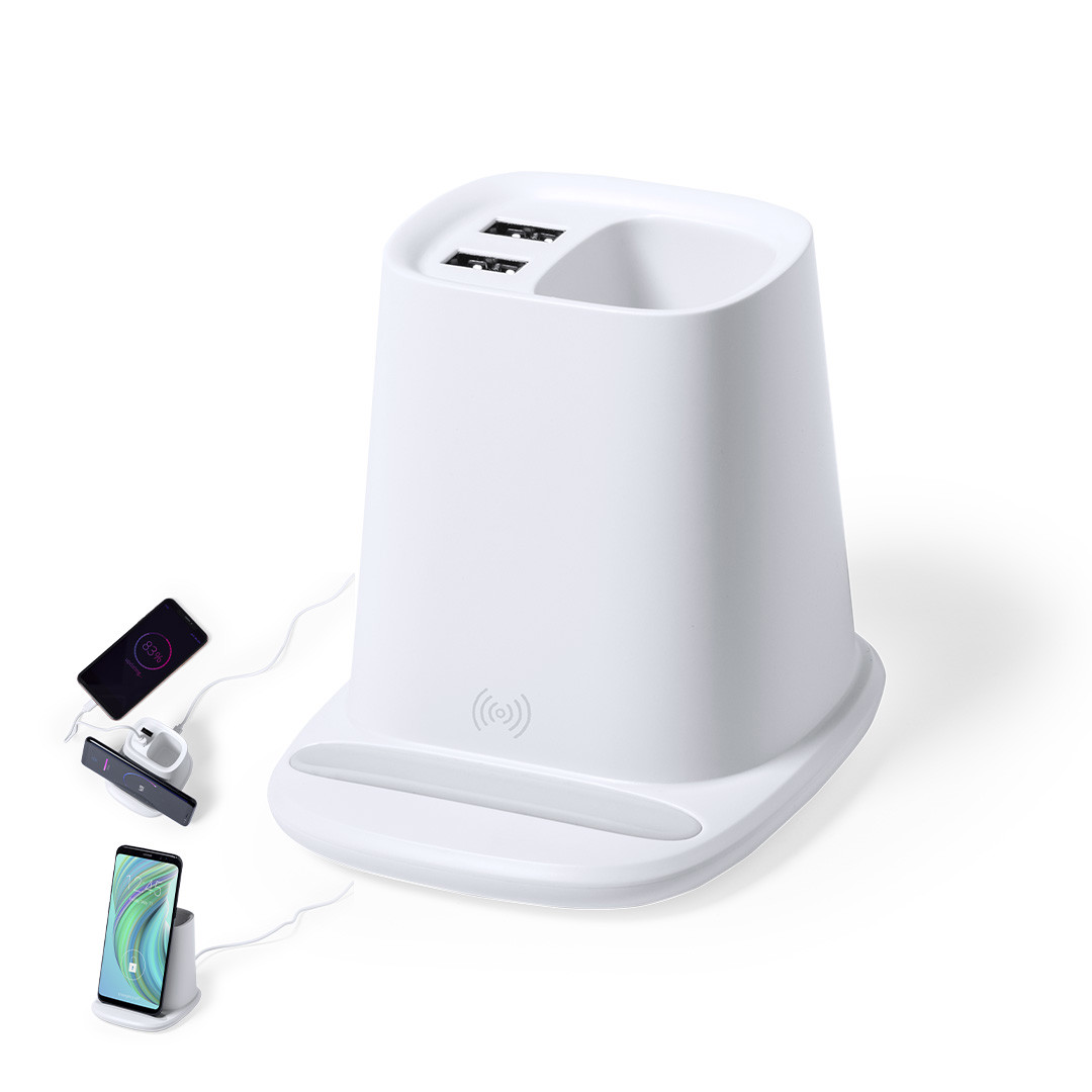 Lapicero multifunción 4 en 1, fabricado en resistente material ABS de color blanco. Con funciones lapicero, soporte para smartphone, cargador inalámbrico 5W y 2 salidas USB de 2.000 mA. Puerto USB inferior, apto para transferencia de datos. Compatible con smartphones con tecnología de carga inalámbrica. Incluye cable tipo C de 1 metro de largo y viene presentado en atractiva caja de diseño. Disponible manual de instrucciones en español e inglés. Cargador Inalámbrico 5W. 2 Salidas USB. 1 Puerto USB 2.0