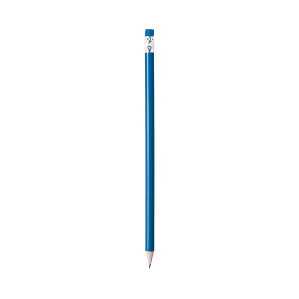 Lápiz de madera de acabado brillo. Con cuerpo redondo y goma de borrar a juego. Disponible en variada gama de colores. Mina negra y punta afilada.