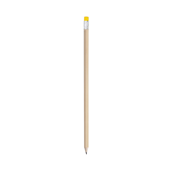 Lápiz de madera de acabado natural. Con cuerpo redondo y goma de borrar -goma disponible en variada gama de colores-. Punta sin afilar.