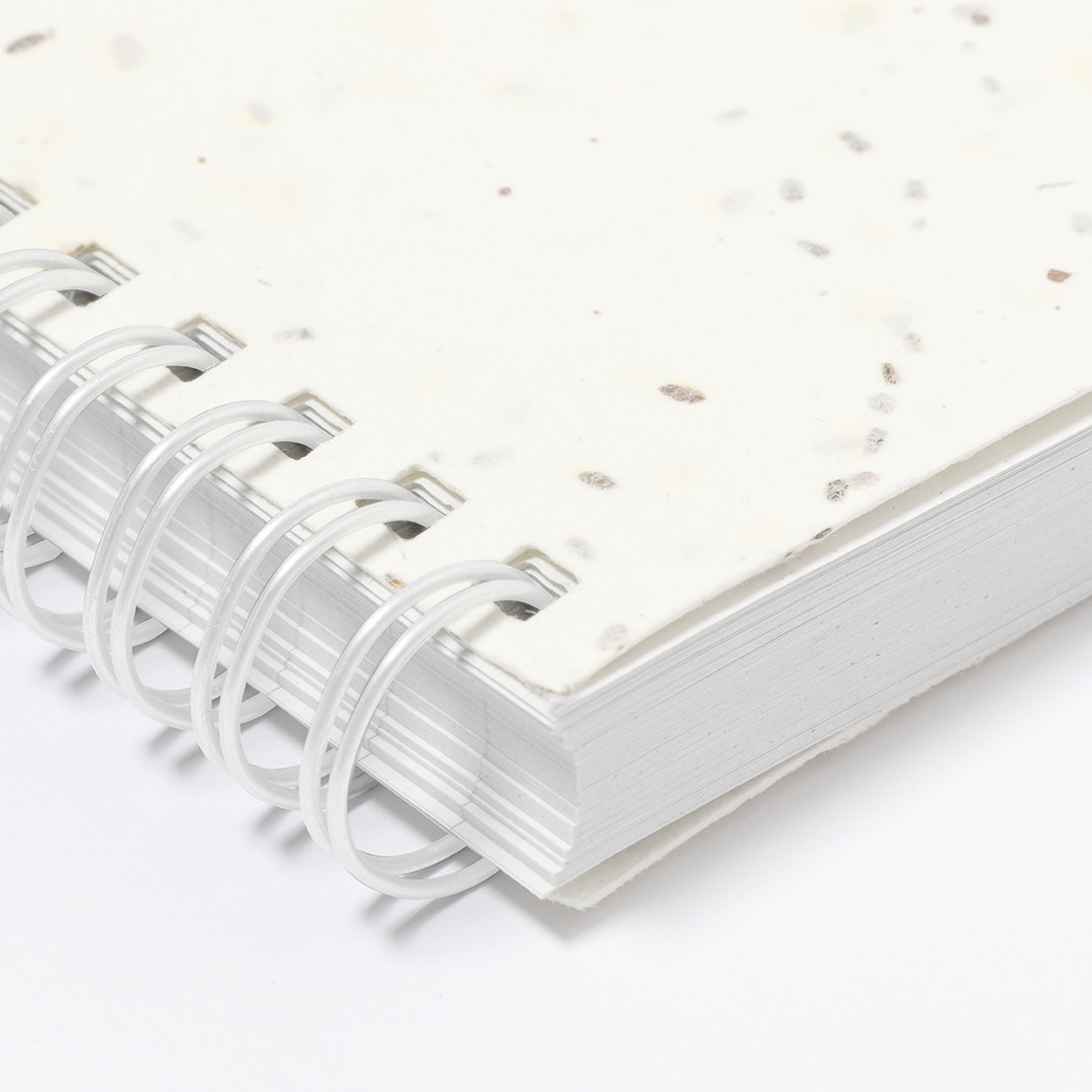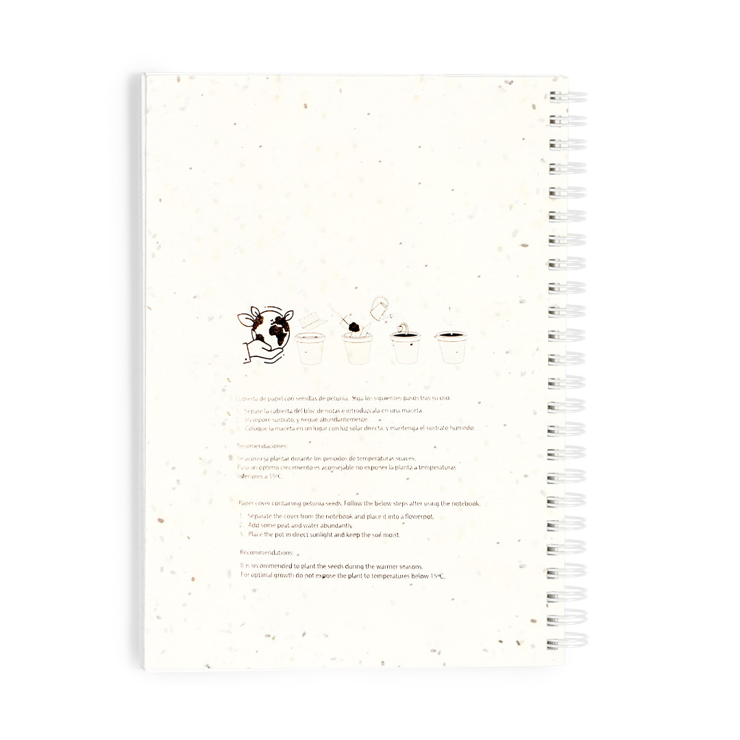 Libreta de anillas con tapas blandas fabricadas en papel de semilla. Con 80 hojas blancas lisas. Las cubiertas incluyen semillas de petunia, convirtiéndolo en papel plantable al final de su vida útil. Incluye instrucciones de plantado en la cubierta trasera y se presenta en una bolsa individual de papel reciclado. 80 Hojas. Semillas de Petunia Incluidas. Flores Colores Surtidos