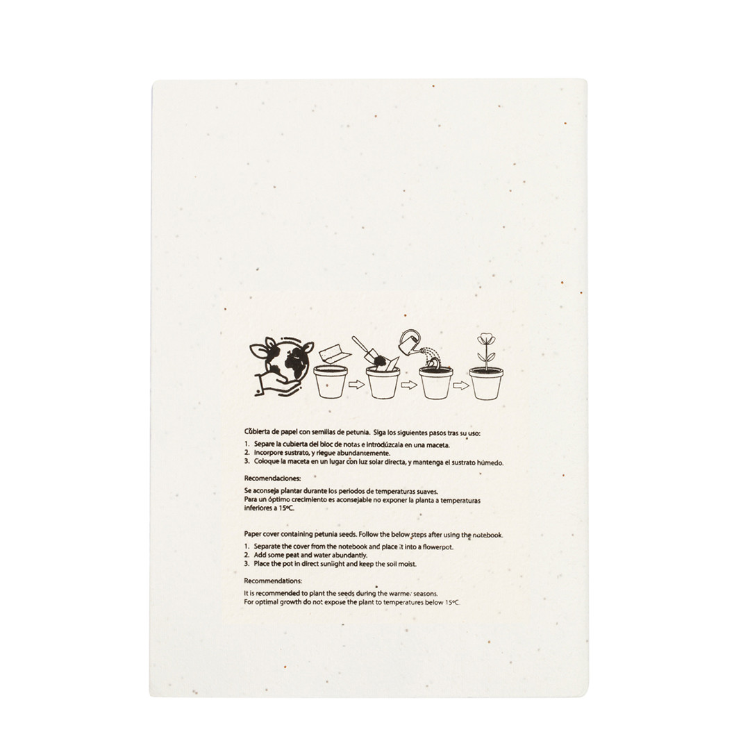 Libreta de tapas blandas con portada y contraportada fabricadas en papel de semillas. Con 60 hojas interiores en color blanco lisas. incluye semillas de petunia en ambas cubiertas, convirtiéndolo así en papel plantable al final de su vida útil. Con instrucciones de plantado y presentado en bolsa individual de papel reciclado. 60 Hojas. Semillas de Petunia Incluidas. Flores Colores Surtidos
