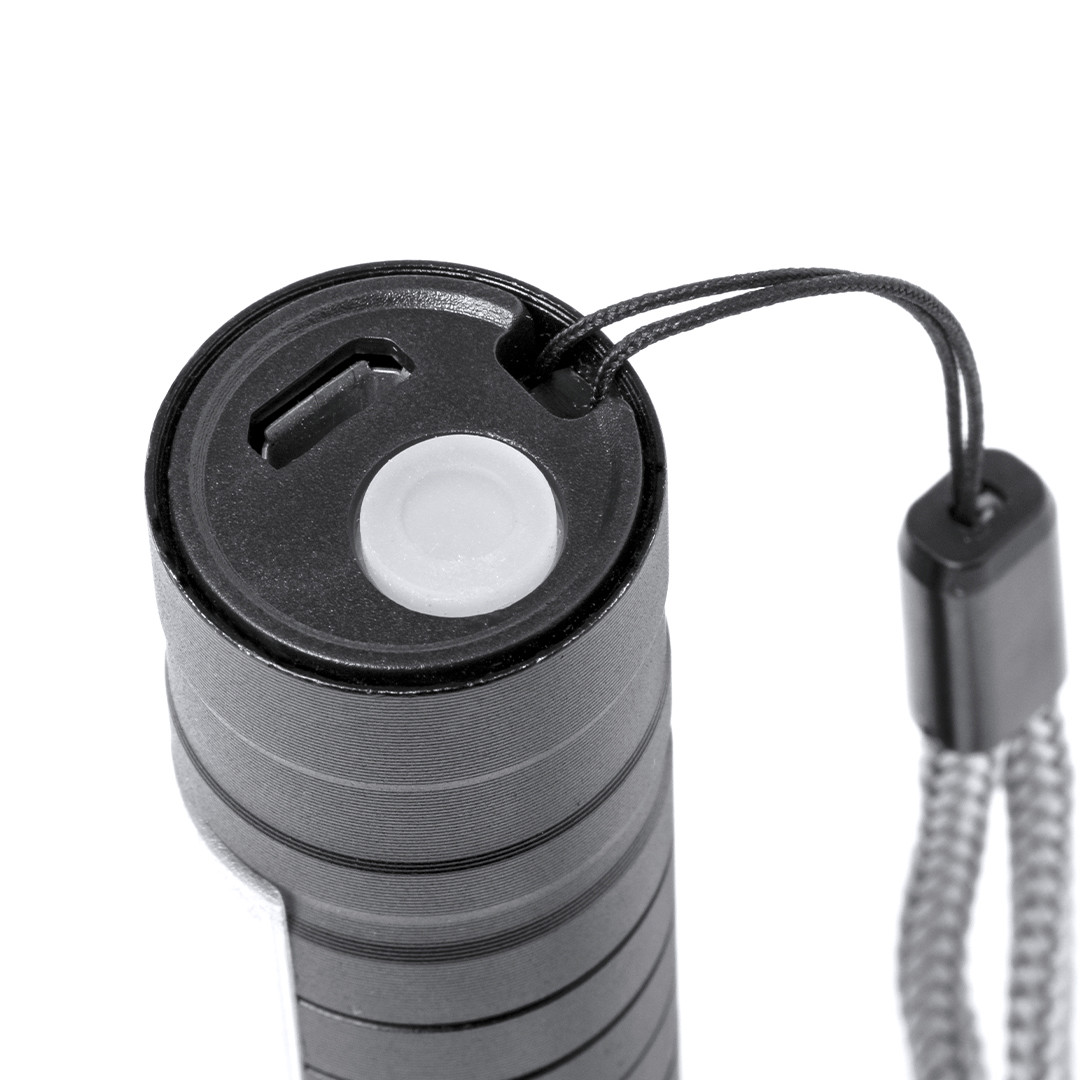 Potente linterna con batería recargable, fabricada en aluminio de acabado en color negro. Luz frontal con 1 LED y cabezal regulable, para tener un enfoque más focalizado o abierto. Además, cuenta con 10 luces COB en el mango y tres modos de iluminación (fija e intermitente de dos velocidades), incluye cinta de trasporte. Se alimenta mediante una batería recargable de 400 mAh, incluido cable micro USB. Presentada individualmente en caja de diseño. 1 Led. 10 Luces COB. 2 Posiciones de Luz, Fija e Intermitente. Batería 400 mAh