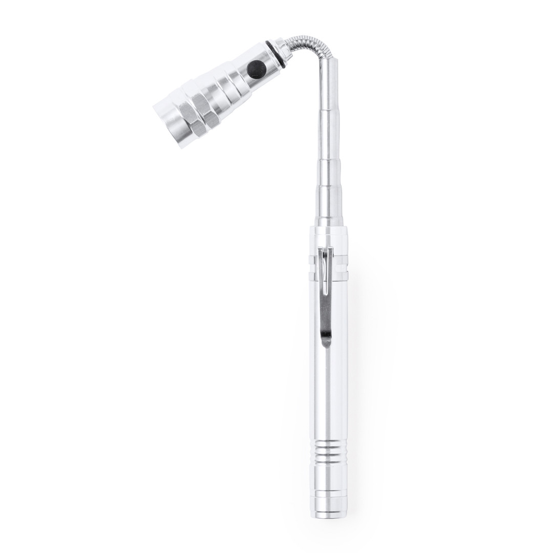 Linterna de aluminio práctica y versátil, con cabezal extensible (triplicando su longitud) y flexible para llegar a todos los lugares, además está equipado con imanes adaptándose a diversas necesidades. Cuenta con 3 potentes LEDs para una iluminación eficiente. Funciona con pilas de botón incluidas y presenta un clip metálico para facilitar su sujeción. Se presenta de manera individual en una caja de diseño kraft. 3 Ledes. Extensible y Flexible. Magnético. Pilas Botón Incluidas