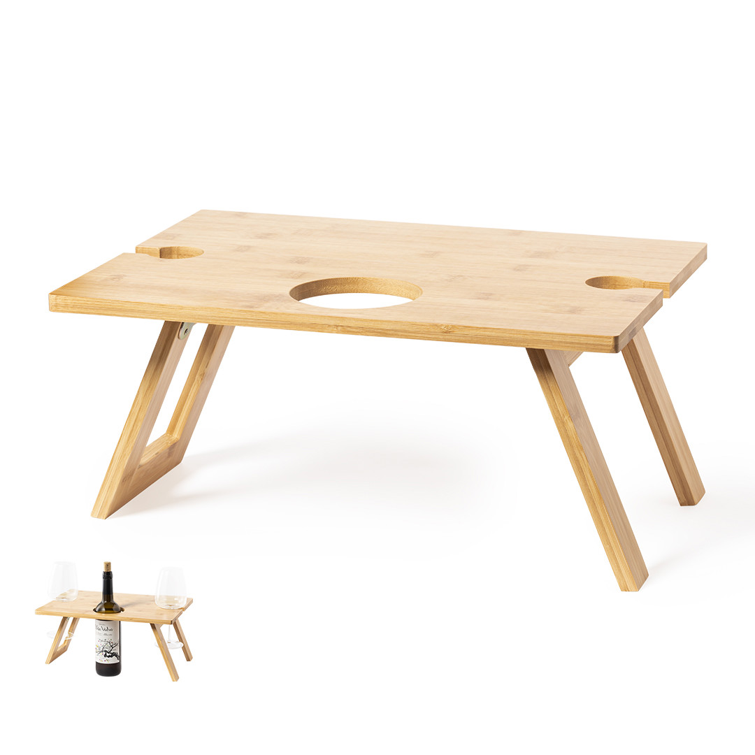 Mesa plegable para los aficionados al mundo del vino. Fabricada en bambú, incluye compartimento para botella de 75cl y 2 soportes para copa. De fácil plegado y tamaño compacto, presentada en atractiva caja individual de diseño eco. Plegable