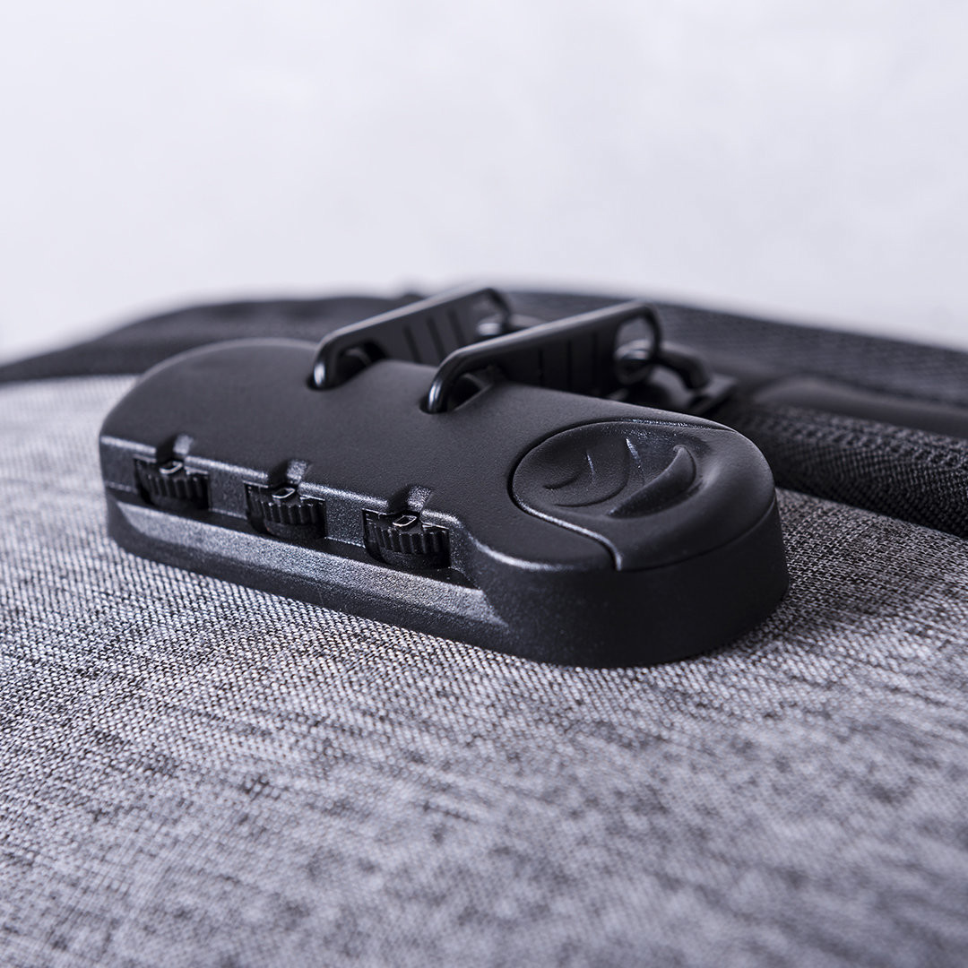 Mochila de negocios antirrobo repelente al agua en poliéster de alta calidad, resistente a cortes y a roces. Con candado de seguridad por contraseña, cinta reflectante trasera y accesorio para acople en trolley. Bolsillo antirrobo en la espalda para guardar objetos de valor. Compartimento interior con salida USB para conexión de powerbank -no incluido-, con cable micro USB de 1 metro de largo para total comodidad en la carga de cualquier dispositivo móvil. Salida para auriculares y bolsillo en cinta derecha con fácil acceso para tarjeta de transporte y otros documents de uso frecuente. Apertura total 180º para fácil acceso al interior de la mochila. Dos compartimento interiores independientes y acolchados para ordenador portátil de hasta 15 pulgadas y para tablets de hasta 10 pulgadas. Con multitud de bolsillos interiores y exteriores. Cintas de hombros y espalda con acolchado ergonómico. Conexión USB. Bolsillo Acolchado para Portátil y Tablet. Parte Trasera y Cintas Acolchadas. Cierre