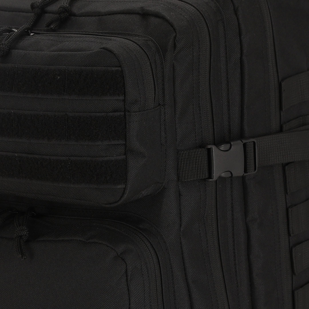 Mochila táctica en resistente poliéster RPET 600D. Parte frontal con múltiples bolsillos, además de soportes elásticos y velcros para colgar los accesorios necesarios durante la aventura. Compartimento principal con cierre de cremallera de doble tirador y bolsillos interiores con varios compartimentos, con capacidad para portátil de 17 pulgadas. Incluye esquinas reforzadas y asa de transporte. Con espalda y cintas de hombros acolchadas y ajustables, y correas frontales para mayor comodidad. Etiqueta con distintivo de RPET.El material RPET se elabora a partir de plástico reciclado, para así fomentar la reutilización de residuos plásticos y ayudar a la sostenibilidad del planeta. Parte Trasera y Cintas Acolchadas