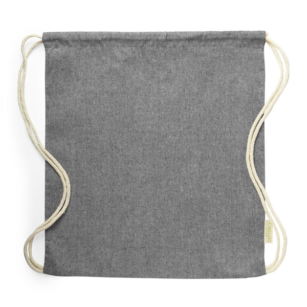 Mochila de cuerdas fabricada en suave poliéster 210D. Con bolsillo frontal de cremallera y salida de auriculares. Cuerdas de autocirre en color gris, a juego con cremallera y esquinas con argollas metálicas y refuerzo de polipiel. En variada gama de colores.
