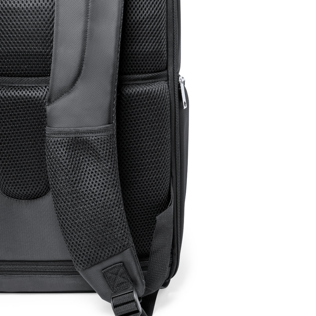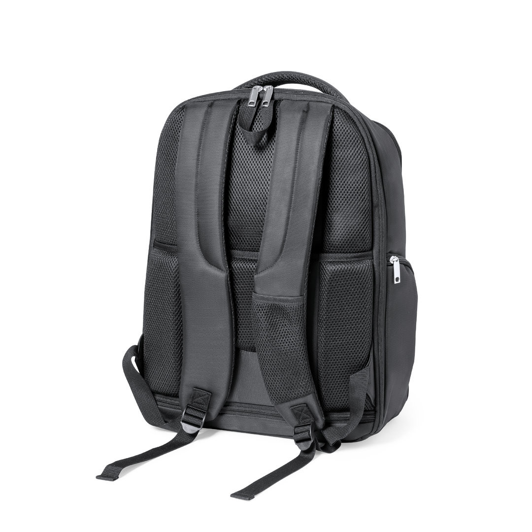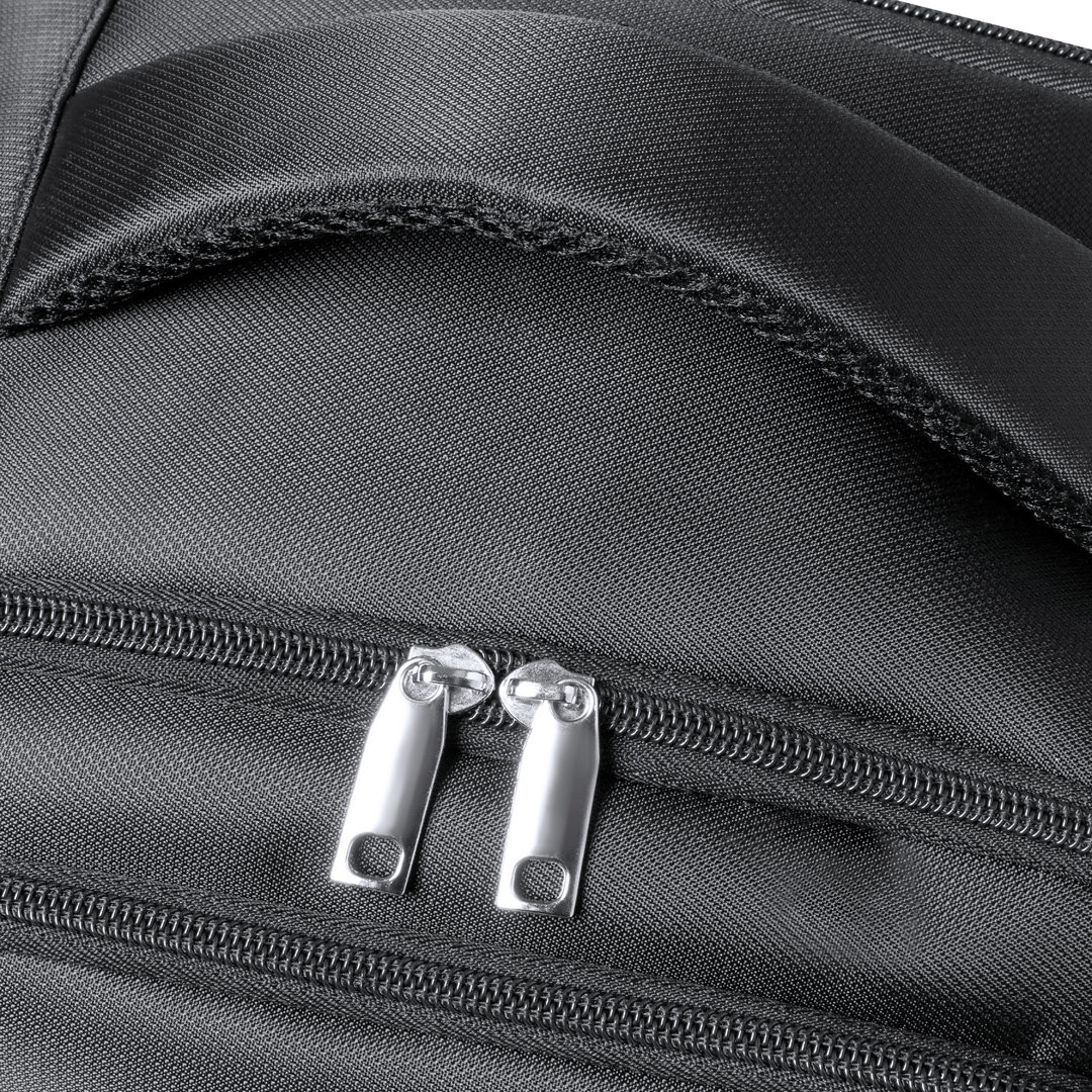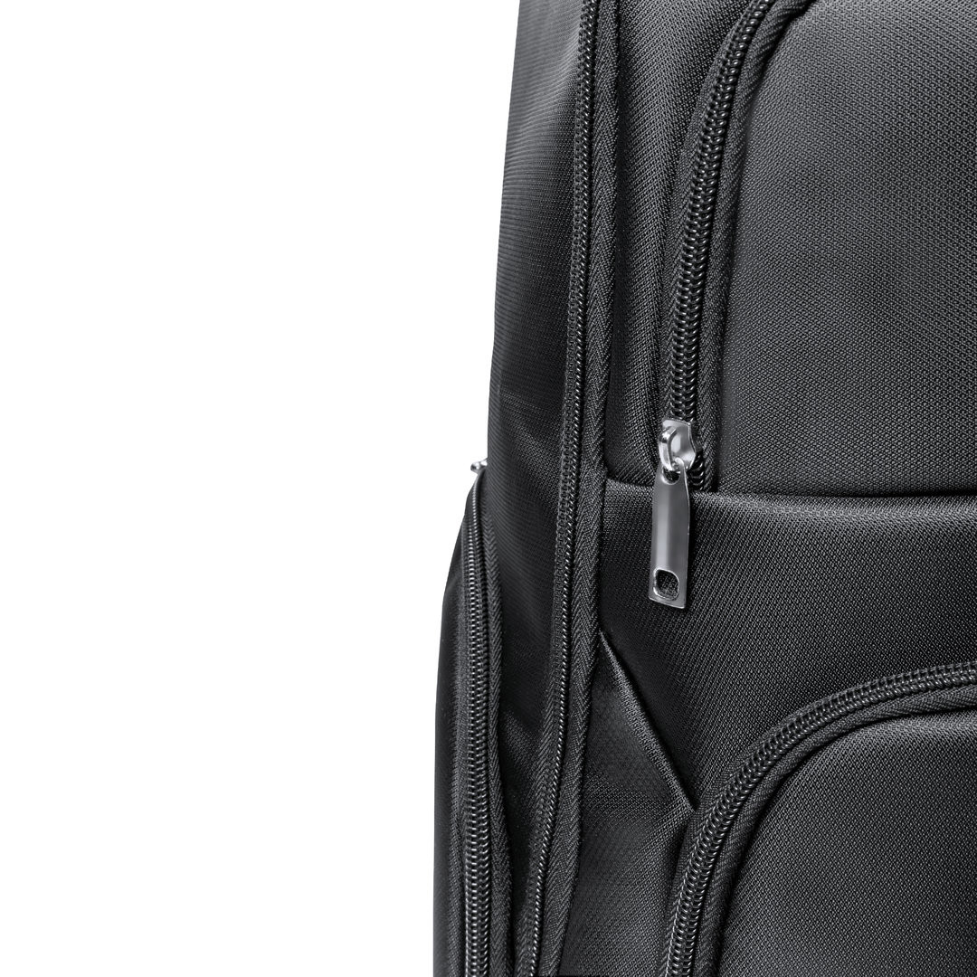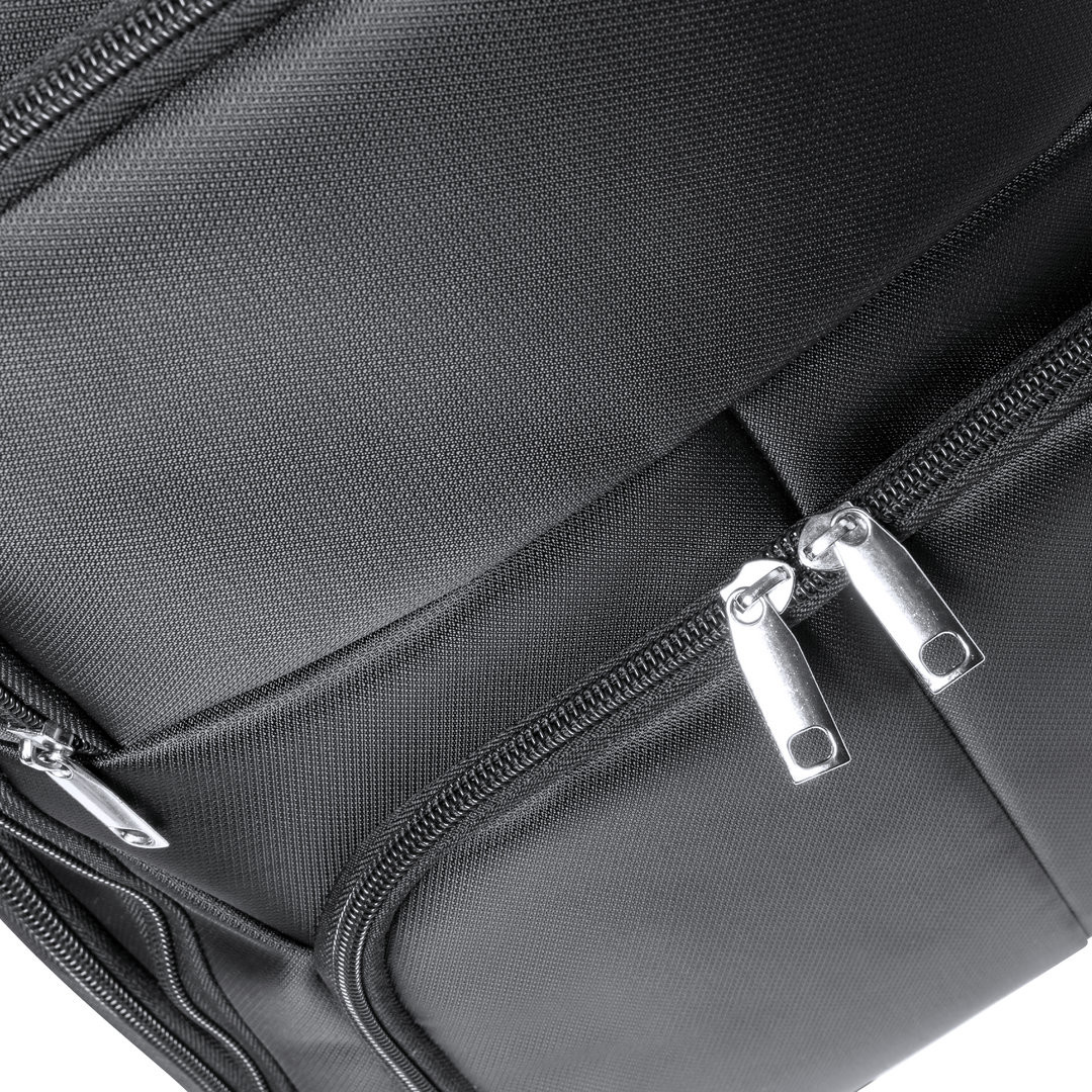 Mochila de calidad premium fabricada en resistente Nyon 600D de acabado en color negro. Compartimento principal con cierre de cremallera a juego y doble tirador. Incluye 3 bolsillos exteriores y 2 bolsillos laterales, todos con cierre de cremallera. Acolchado en asa, parte trasera y cintas para hombros, que además son ajustables. Interior con compartimentos acolchados para ordenador portátil de hasta 17 pulgadas y tablet de hasta 12 pulgadas. Accesorio en espalda para ajuste en trolley. Bolsillo Acolchado para Portátil y Tablet. Parte Trasera y Cintas Acolchadas