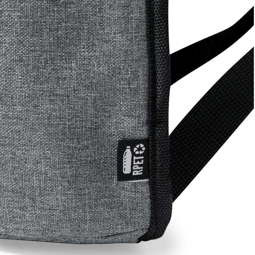 Mochila nevera fabricada en resistente 600D RPET. Acabado en color gris, con asa de transporte. Cintas para hombros acolchadas y ajustables. Compartimento principal con cierre de cremallera y tiradores metálicos. Interior isotermo en aluminio y etiqueta exterior con distintivo RPET.El material RPET se elabora a partir de plástico reciclado, para así fomentar la reutilización de residuos plásticos y ayudar a la sostenibilidad del planeta. Cintas Acolchadas