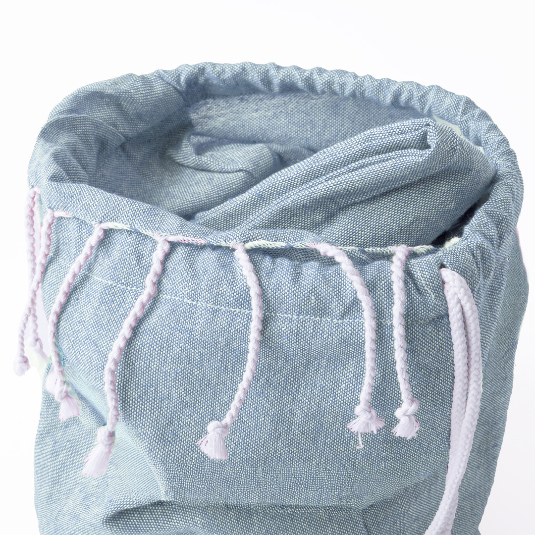 Mochila de cuerdas fabricada en suave poliéster 210D. Con bolsillo frontal de cremallera y salida de auriculares. Cuerdas de autocirre en color gris, a juego con cremallera y esquinas con argollas metálicas y refuerzo de polipiel. En variada gama de colores.