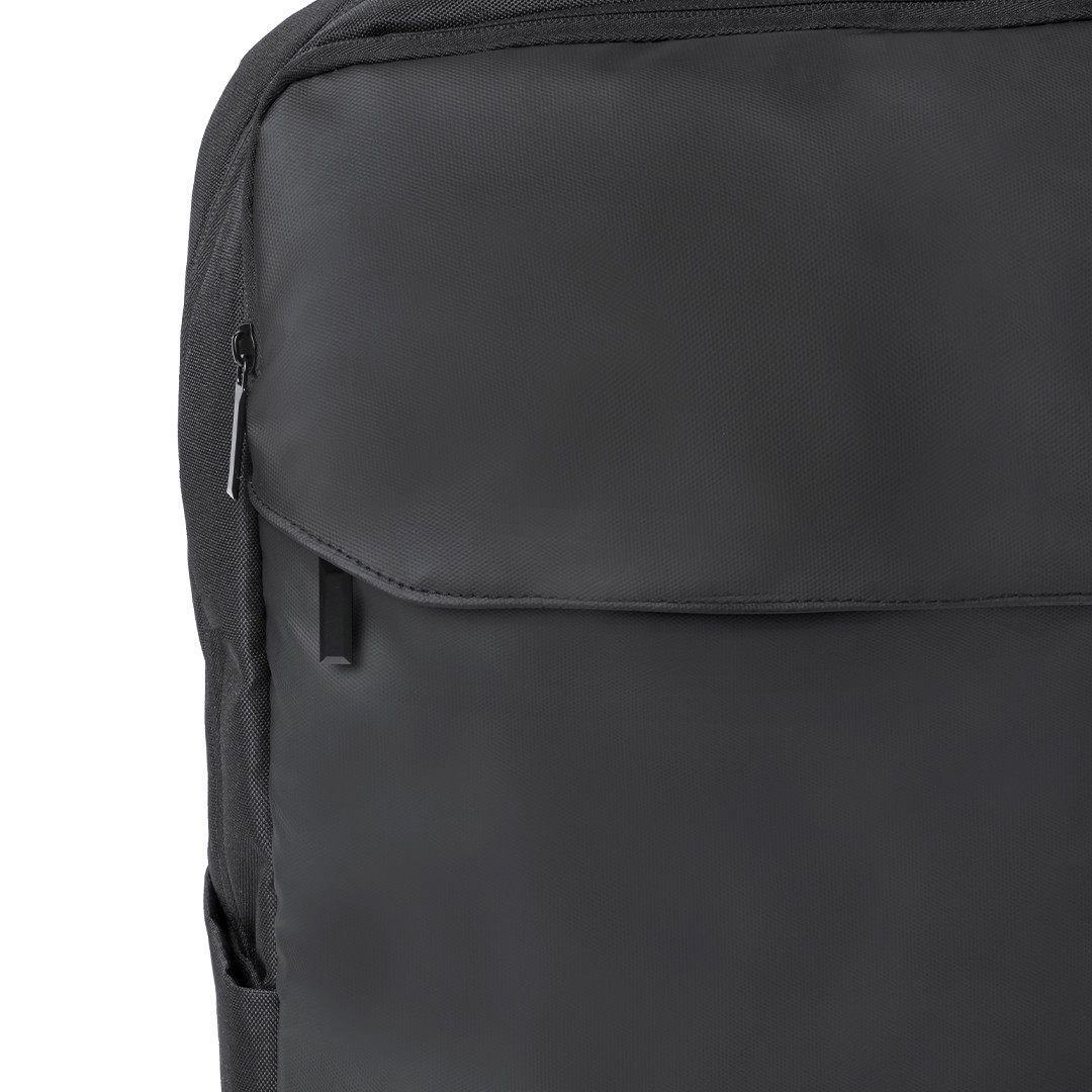 Mochila confeccionada en elegante polipiel. De diseño urbano que incluye un bolsillo central acolchado con doble cierre para tablet de hasta 10 pulgadas y portátil de hasta 15 pulgadas, así como un bolsillo segundario. Además, tiene un bolsillo frontal con cremallera y solapa protectora. Las cintas de hombros y la espalda son acolchadas, ajustables y cuentan con una tela transpirable. Incorpora un accesorio para ajustarse al trolley y una cómoda asa en la parte superior. Presentada en una bolsa individual reciclada. Bolsillo Acolchado para Portátil y Tablet. Parte Trasera y Cintas Acolchadas