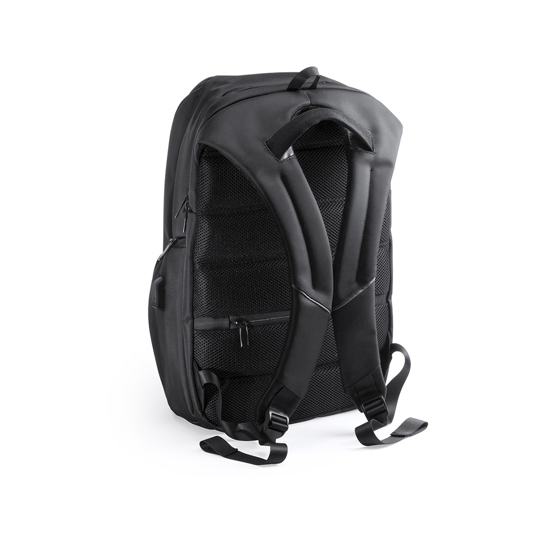 Elegante mochila de negocios resistente al agua en nylon de alta calidad. Con compartimento interior con salida USB para conexión de powerbank -no incluido-, incluye cable micro USB de 1 metro de largo para total comodidad en la carga de cualquier dispositivo móvil. Con compartimento interior acolchado para ordenador portátil de hasta 15 pulgadas y multitud de bolsillos interiores y exteriores. Cintas de hombros y espalda con acolchado ergonómico. Conexión USB. Bolsillo Acolchado para Portátil. Parte Trasera y Cintas Acolchadas