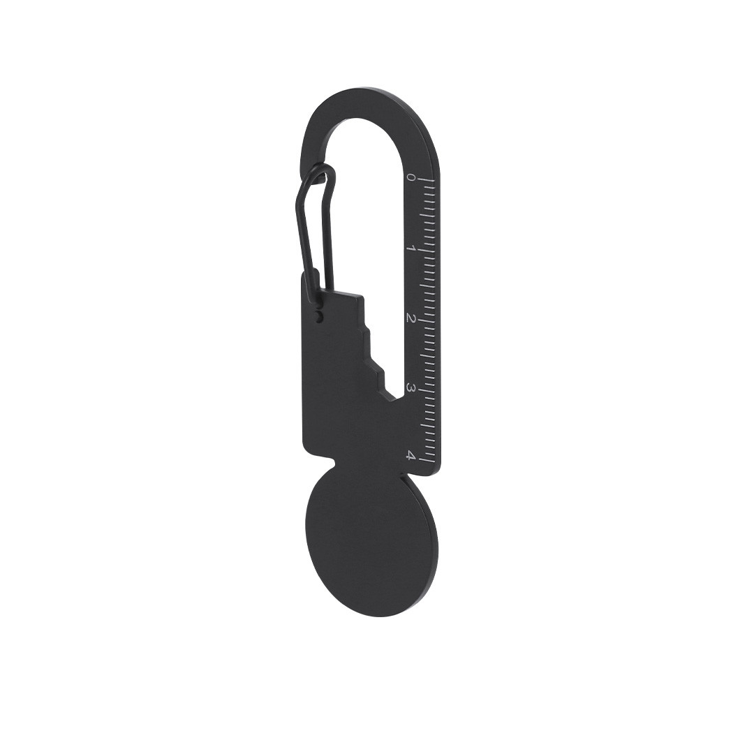 Multiherramienta de acero inoxidable y acabado negro mate. Diseñada para adaptarse a múltiples necesidades, incluye 8 funciones: llave para tuercas hexagonales en varios tamaños, regla para mediciones, abrebotellas, moneda para carro de compra, etc. Con cierre de mosquetón. 8 Funciones