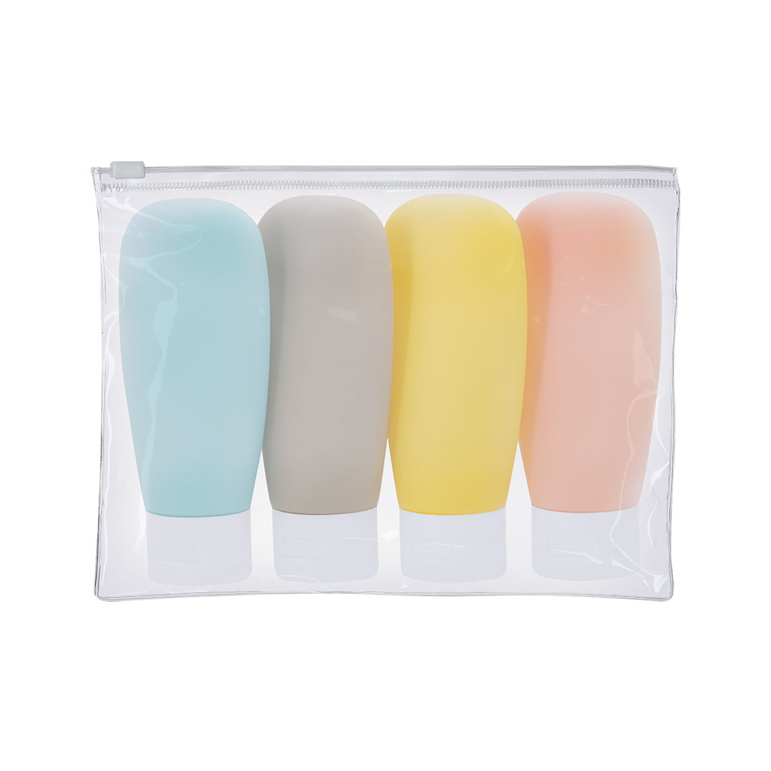 Neceser de viaje con botes de PVC. Incluye 4 botes de 60 ml de capacidad, en diferentes colores (rosa, azul claro, amarillo y gris) y suave acabado gomoso, ideales para organizar líquidos y productos de cuidado personal. Presentado en neceser transparente de PVC con cierre hermético. 4 Accesorios